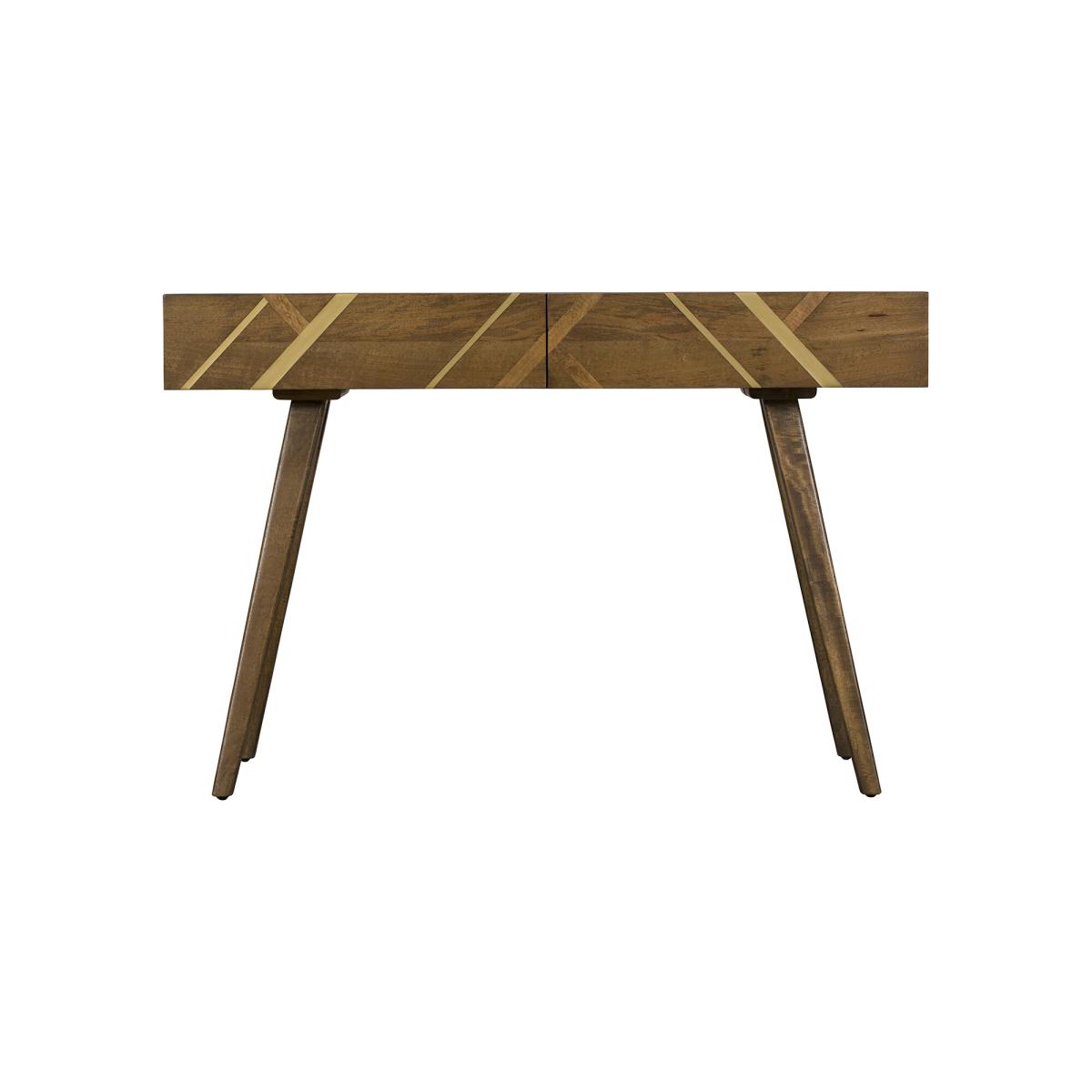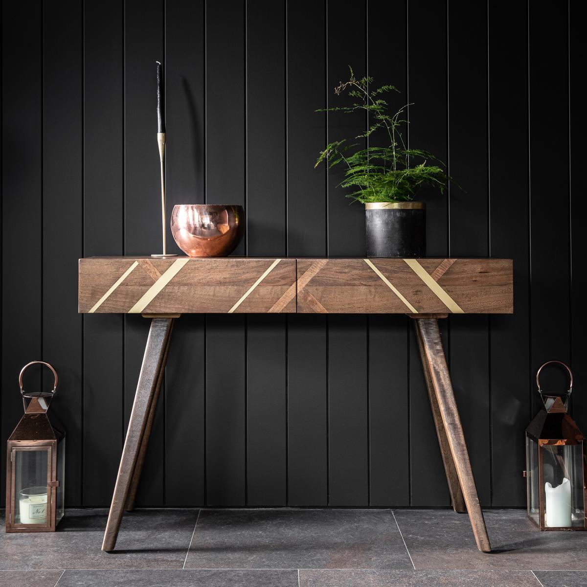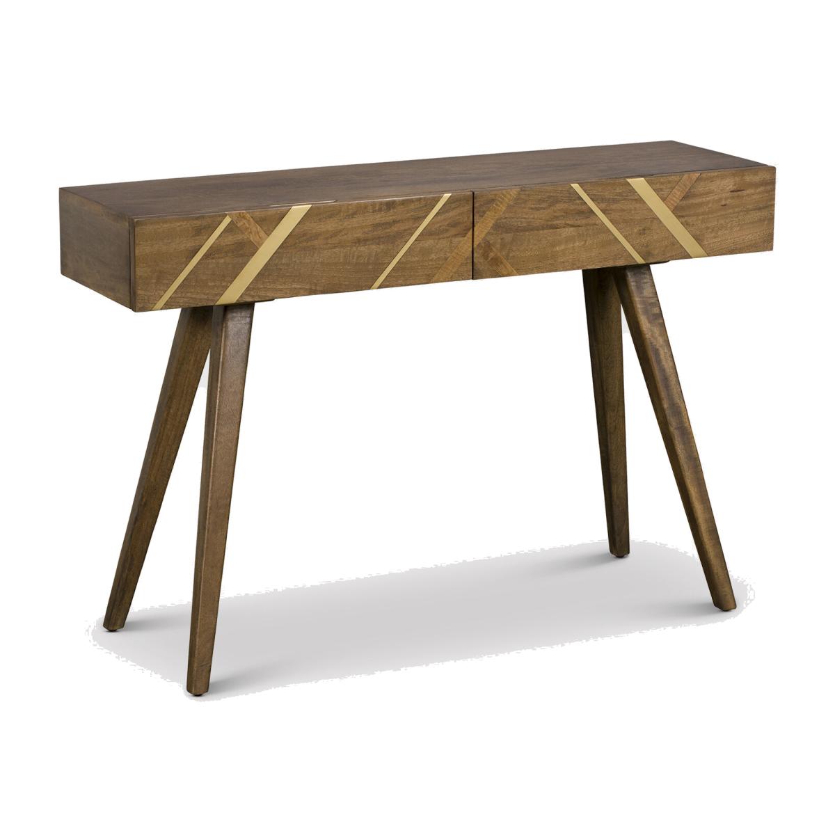 Enhance any space with the versatile Sondra Solid Mango Wood Console Table. Crafted from solid mango wood with painted brass inlays, it provides ample storage and display space. The tall, splayed legs impart an open and airy feel, making it a welcoming addition to your entryway or living room. This console table is poised to make a statement, effortlessly combining style and practicality in a timeless and chic manner.