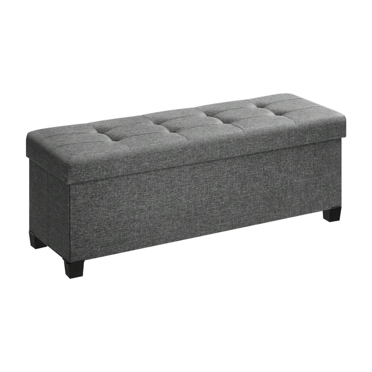 This elegant storage ottoman features a chic linen-look surface with a stylish tufting design, ensuring enduring comfort with its double-layer fabric and high-resilience foam. Built to endure, it is crafted from robust MDF panels and reinforced with metal corner guards, supporting up to 300 kg for a lasting seating or storage solution. Measuring 38 x 110 x 40 cm, it offers a generous 112 L volume for storing blankets, books, and bed sheets, complete with a removable divider for organisation. The thoughtful legs elevate the bench for cleanliness and stability, making it a multifunctional addition to any living room, bedroom, entryway, or dorm room.