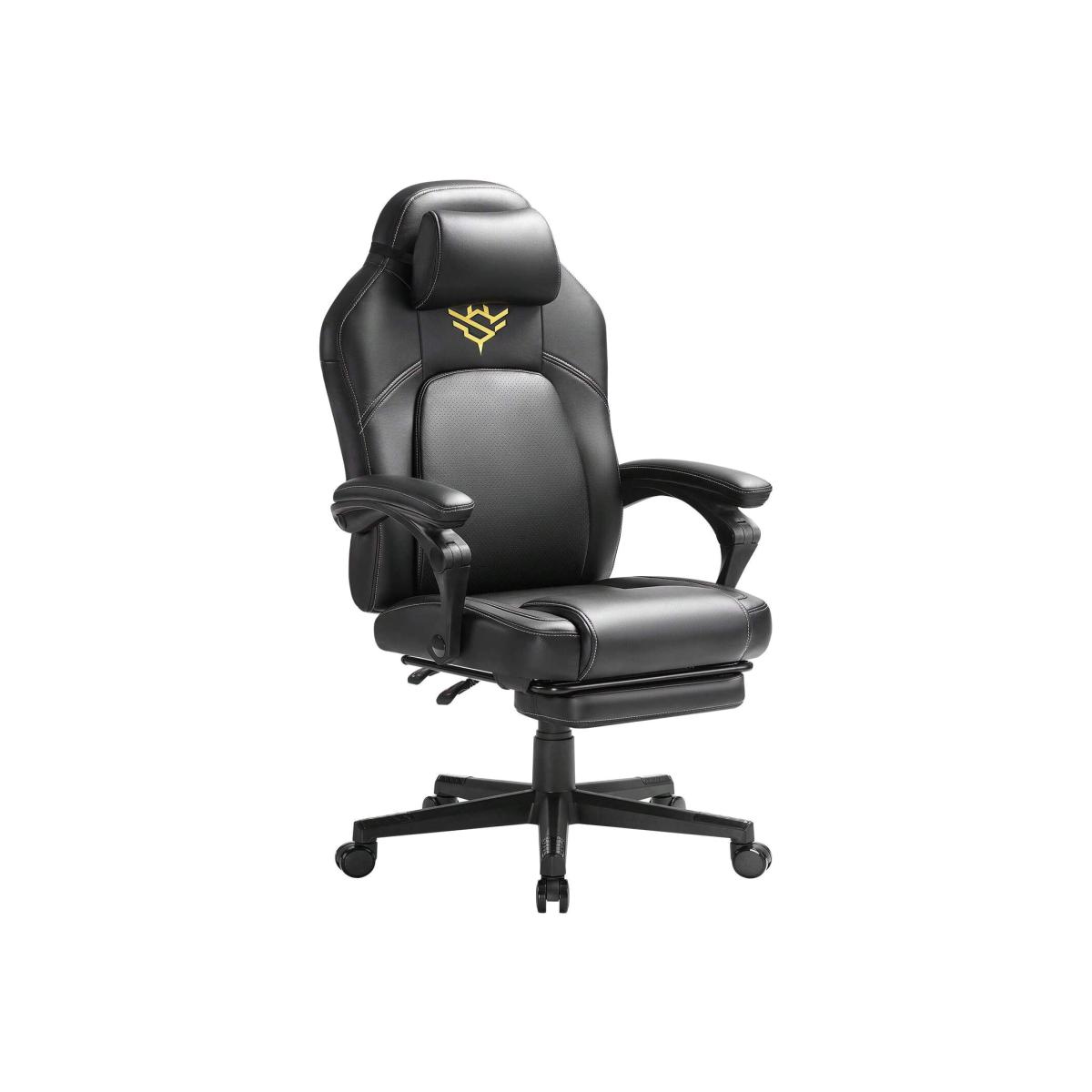 Elevate your gaming experience with this ergonomic computer chair, featuring a sleek synthetic leather surface and vibrant gold accents for a stylish look. Designed for comfort, it conforms to your body's curves with well-padded lumbar support, linkage armrests, and a headrest, ensuring all-around support during gaming marathons. Enjoy flexibility with a reclining backrest between 90-135, an adjustable seat height of 10 cm, and a convenient footrest. The silent PU castors allow for smooth movement, while the easy-to-clean surface keeps your chair pristine. With proven quality, it has passed strength and durability tests, making it a reliable choice for avid gamers.