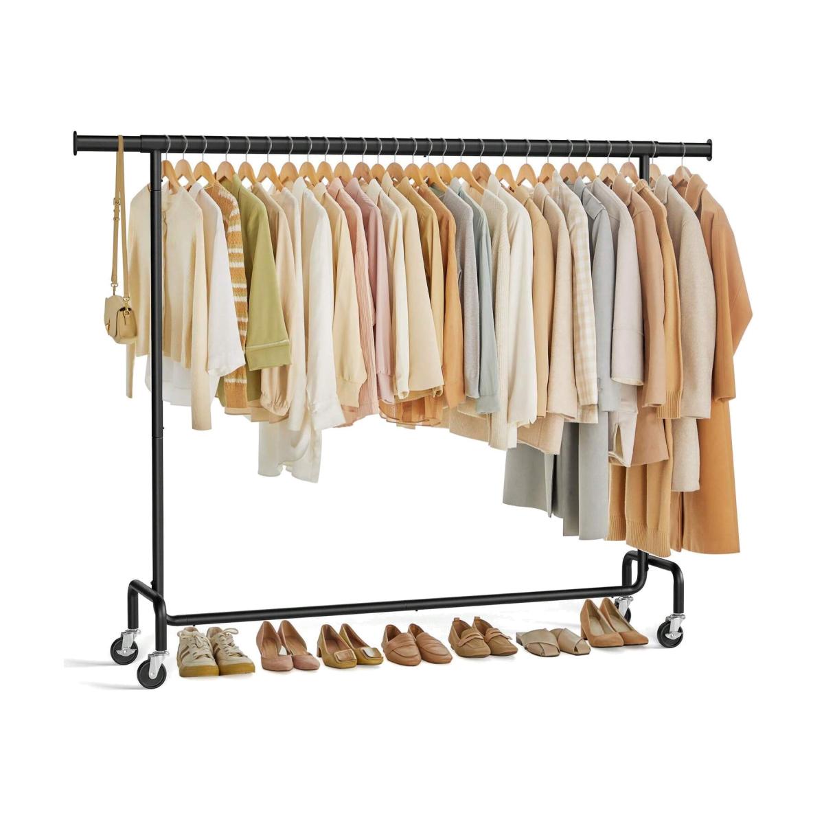 This heavy-duty clothes rack on wheels features a robust design with 1 mm thick steel tubes, supporting up to 110 kg, making it perfect for heavy coats. The extendable hanging rail stretches from 160 cm to 200 cm, providing additional space for handbags, hats, and scarves. Equipped with four 360 swivel castors, two of which are lockable, it allows for easy movement and secure placement. Assembly is a breeze with no tools required, and it can be easily disassembled for compact storage. Versatile in use, its ideal for hanging clothes in bedrooms or living rooms, drying laundry, and even outdoor use, with ample space for shoes at the bottom.