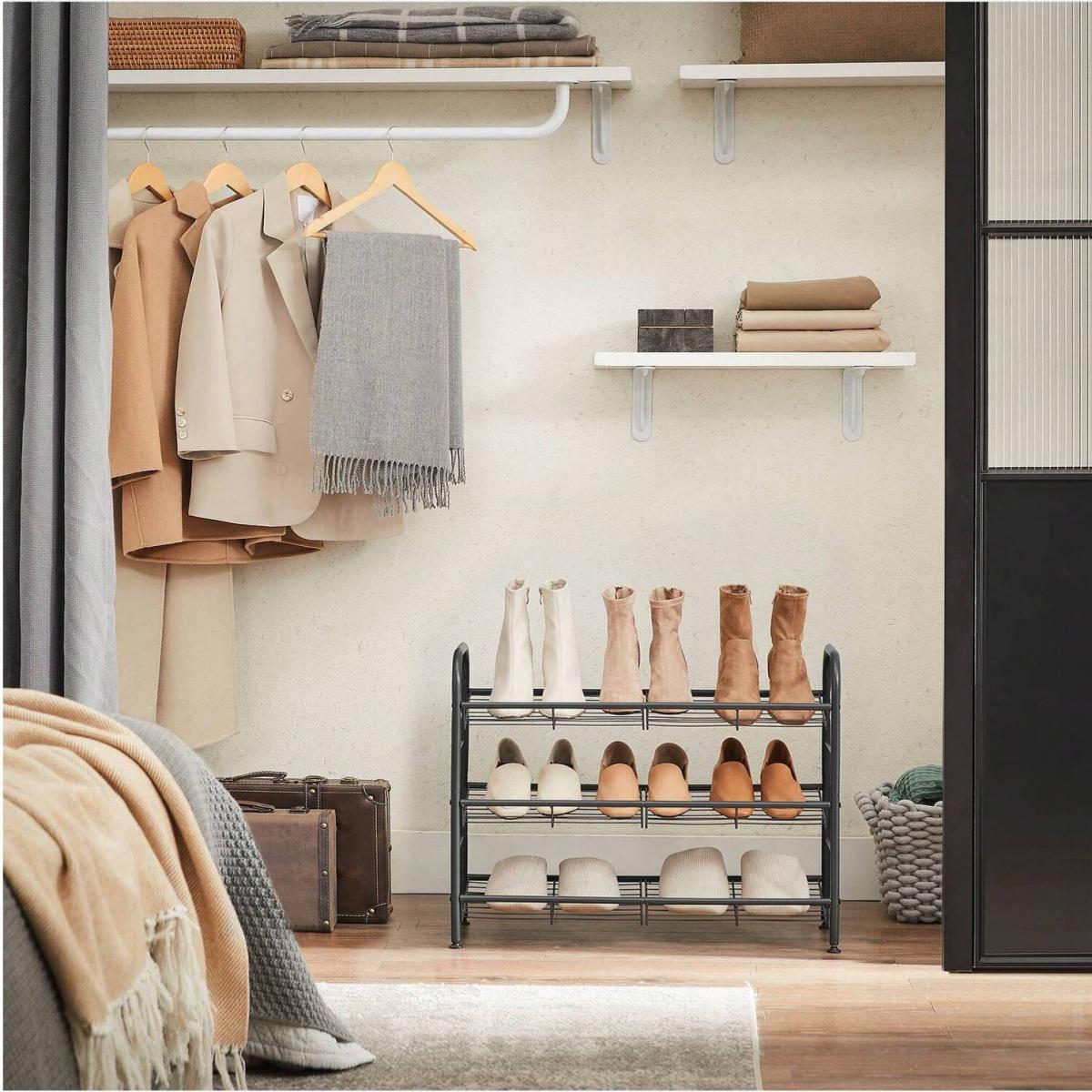 I love this shoe rack for its practicality and sleek black finish, making it a versatile addition to many interior styles. It works particularly well in minimalist, modern, or industrial spaces where clean lines and functional design are key. The three-tier construction maximises storage without taking up much space, so it’s great for keeping footwear organised in the hallway or inside wardrobes. To style it effectively, consider grouping shoes by colour or type for a tidy look, and add a small basket or decorative box on top to hold accessories. Its simple design can seamlessly blend into various interiors, making it both a practical and visually unobtrusive storage solution.