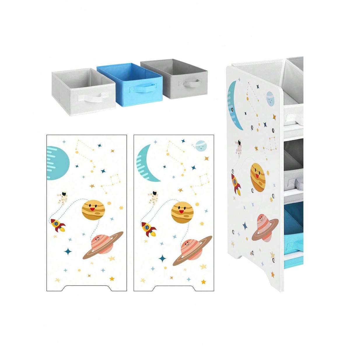 This children's storage organiser features a charming space pattern and includes 9 removable boxes made of non-woven fabric, perfect for keeping toys and books tidy in a child's room, playroom, nursery, or school. Designed with stability in mind, it comes with an anti-tip kit and rounded corners for safety. The clever design allows for easy access, as the height is suitable for kids, and the boxes can be arranged flat or inclined for categorised storage. Assembly is quick and straightforward, requiring just the attachment of bars to panels and placement of boxes. Enjoy customised customer service before and after your purchase!