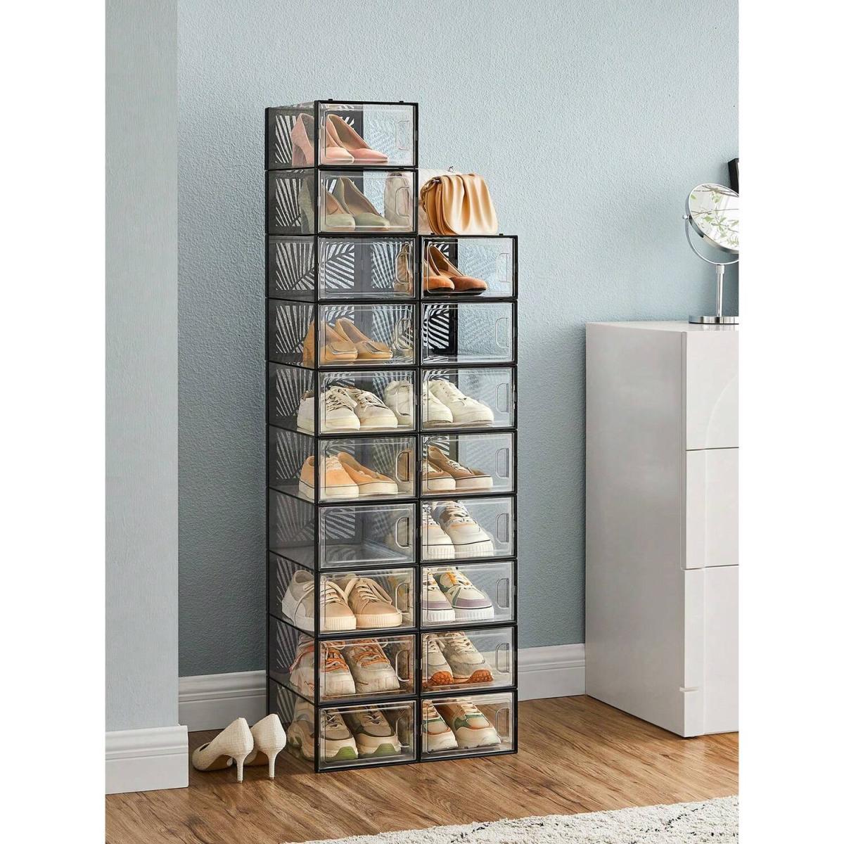Organise your footwear collection with this set of 18 clear shoe storage organisers, designed to accommodate a maximum UK size 11. These stackable and breathable boxes are perfect for displaying trainers and high heels, ensuring your shoes remain visible and protected. The transparent design allows for easy identification of contents, while the black accents add a touch of elegance. Additionally, these foldable boxes offer convenient storage solutions, making them ideal for any space. Keep your shoes in pristine condition and effortlessly accessible with this practical and stylish storage option.