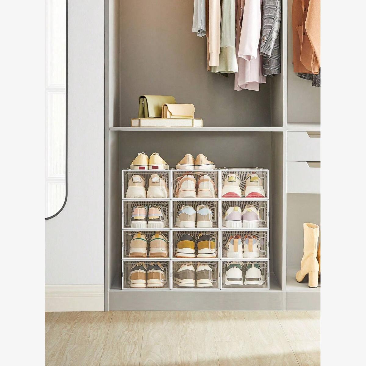 Organise your footwear collection with this set of 12 clear shoe storage organisers, designed for maximum UK size 11. These stackable and breathable boxes provide an ideal solution for displaying trainers and high heels while keeping them protected. The transparent design allows for easy visibility, making it simple to find the perfect pair at a glance. Additionally, the foldable feature ensures convenient storage when not in use. With a sleek white finish, these shoe boxes not only enhance your space but also offer practicality and style, making them a must-have for any shoe enthusiast.