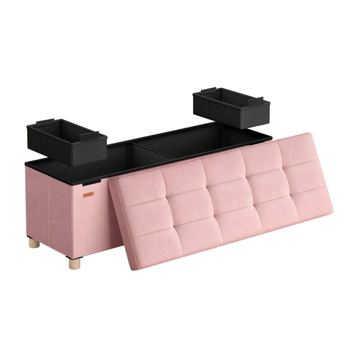 This folding storage ottoman, measuring 38 x 110 x 40 cm, features a soft velvet surface and foam padding for comfort, making it perfect for sitting or resting feet. Its tufted design and natural wood grain legs add refined elegance to any living space. Crafted with a 9 mm thick MDF top and base, along with solid wood legs, it supports up to 300 kg for a reliable seating experience. With a large storage capacity of 112 L, its ideal for organising sheets, pillows, blankets, and magazines. The unique folding design allows for easy setup and convenient storage, making it versatile for use as a storage box, footrest, or coffee table.