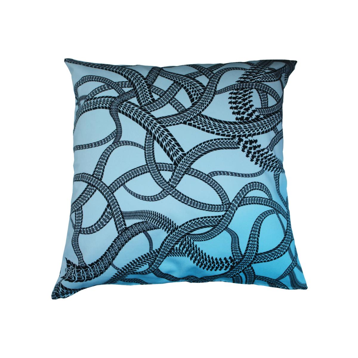 Colourful digitally printed Sonia cushion is featuring print of tire tracks. This large cushion is printed on both sides and is a large size. This cushion is up cycled from the fabrics left from our clothing production. Made in our studio in London. Machine wash in 30c 97% Cotton 3% Spandex