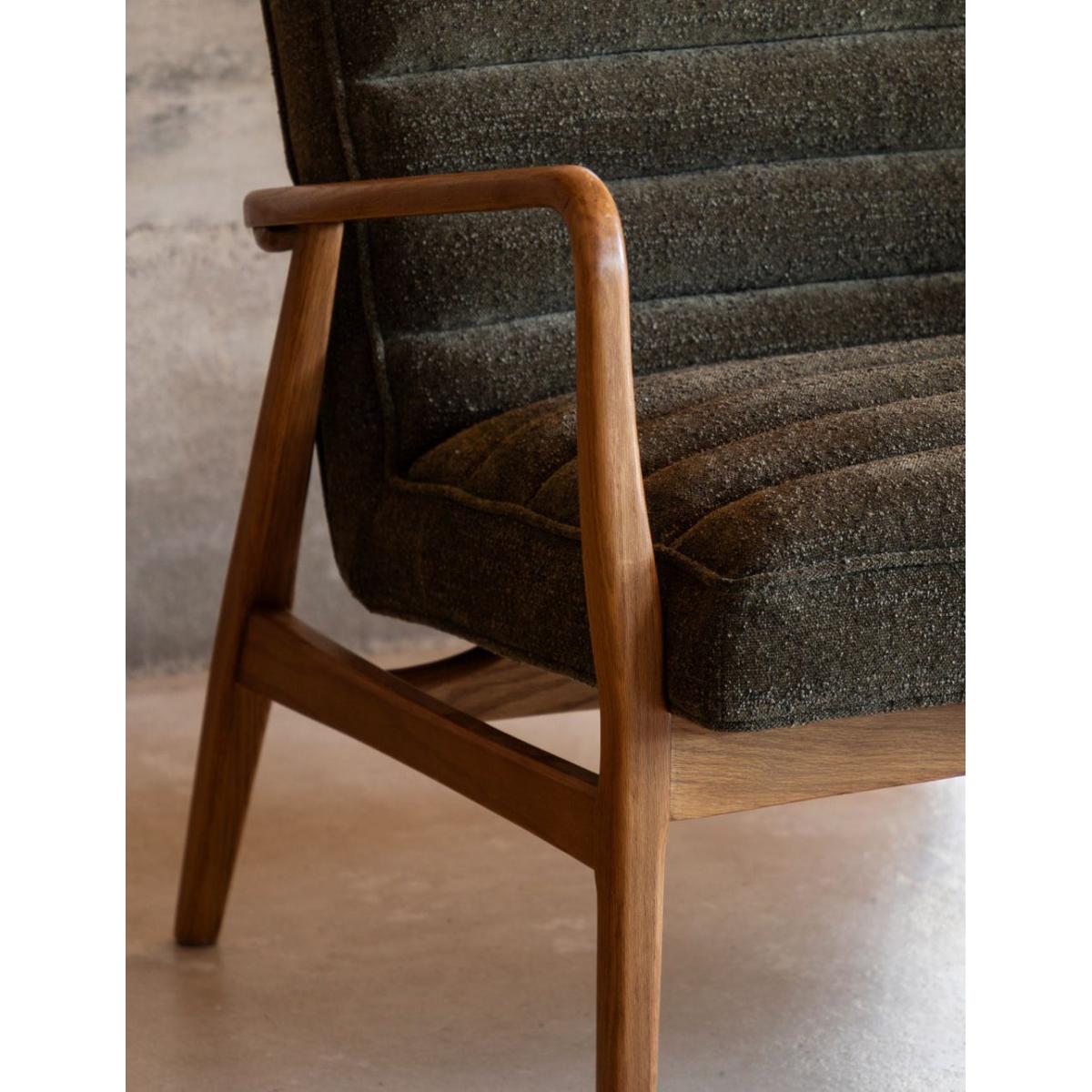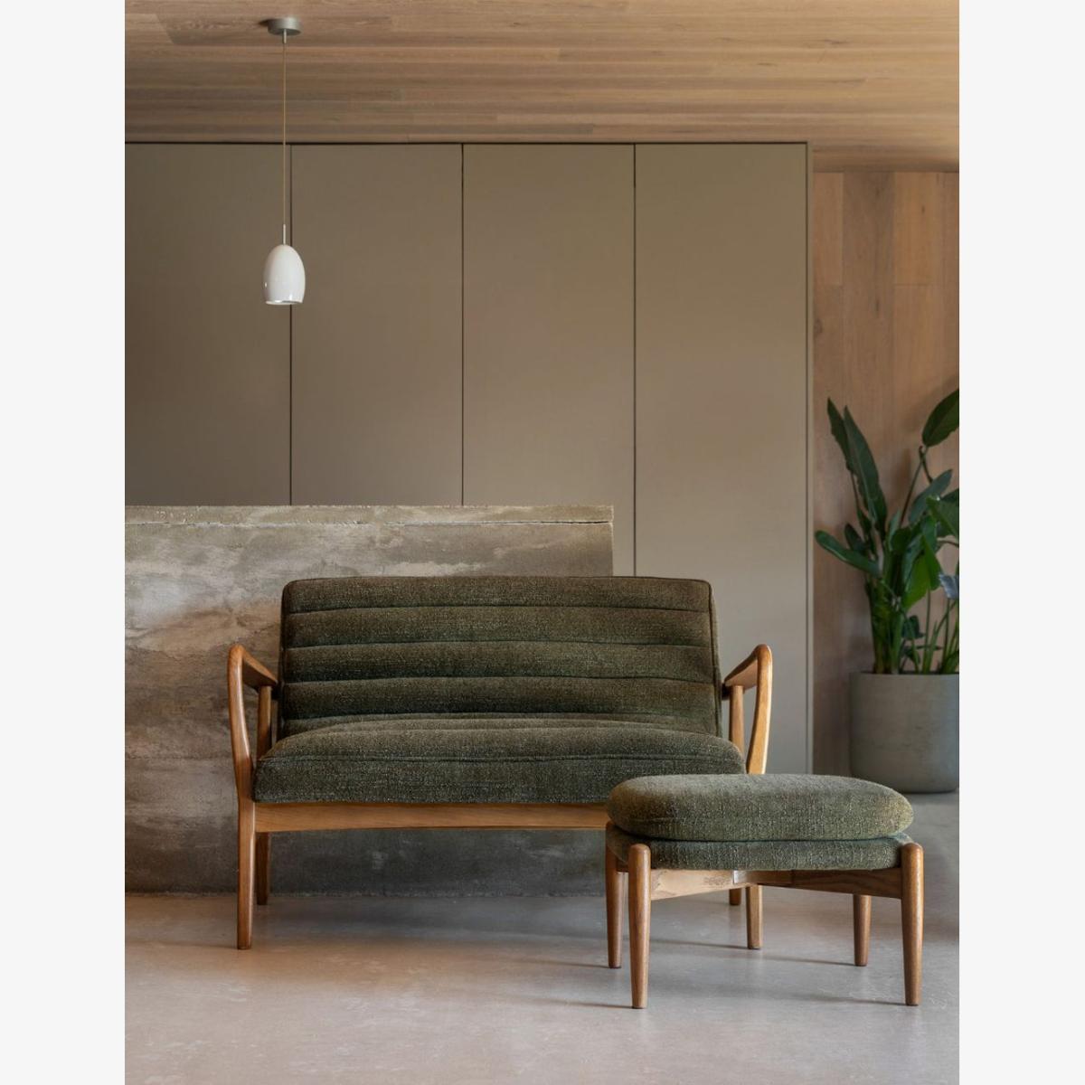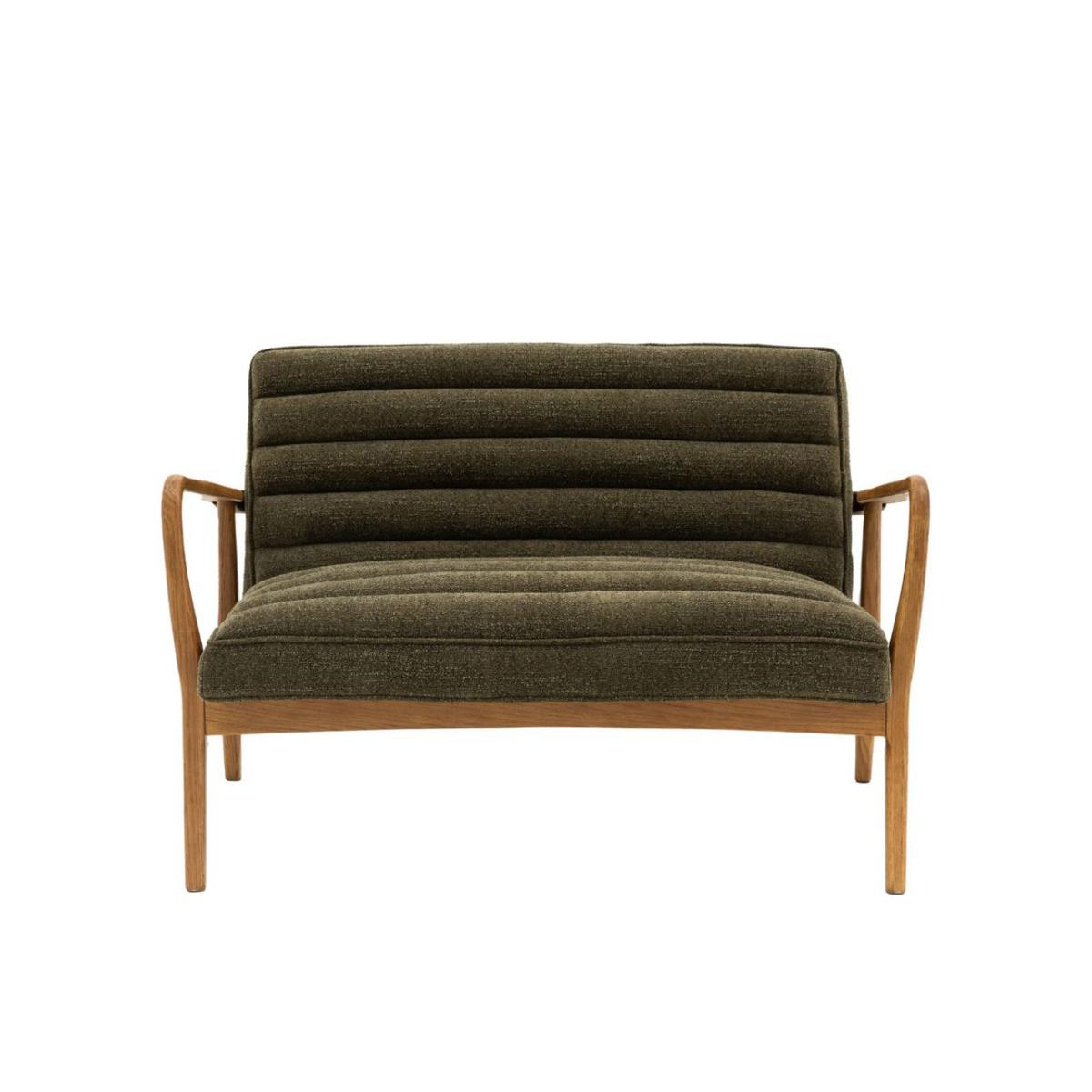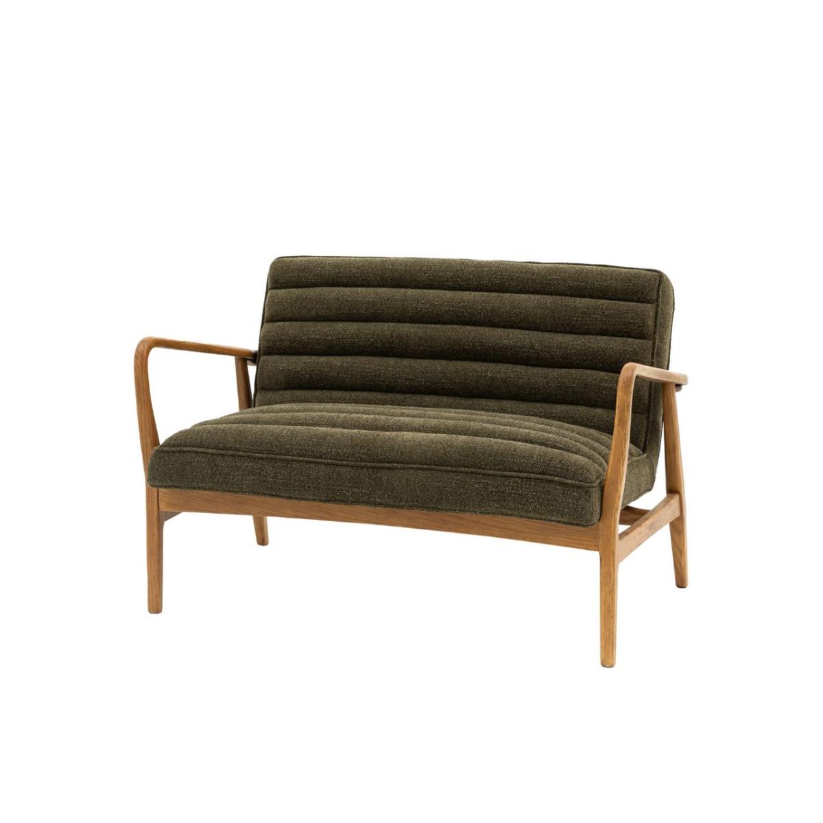 Featuring a sleek wooden frame with beautifully curved arms, this two seater sofa is upholstered in a plush, boucle fabric in deep green, offering a cosy and stylish place to sit and relax. Also available as an armchair and footstool Featuring a sleek wooden frame with beautifully curved arms, this sofa is a cosy and stylish place to sit and relax