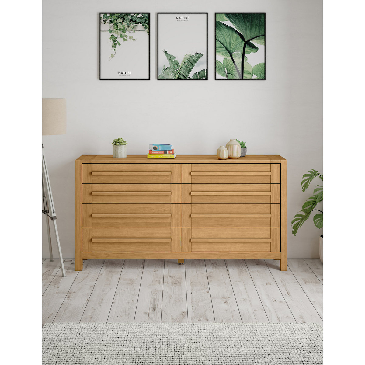 Organise your everyday items beautifully in this stunning Sonoma™ eight drawer chest. With quality, soft close drawers for effortless luxury, by simply adding a mirror this chest of drawers will double up as a dresser. Offering a more rustic feel with exposed knots and grain detail, natural of solid oak, this modern drawer cabinet boasts an organic look. Expertly crafted predominately with sustainable solid oak and oak veneer in our M&S Eco Factory, it's also coated with a durable lacquer for added strength and resilience. We're so confident our furniture is built to last, our industry-leading guarantee covers any manufacturing failure on all furniture. That's our promise, and why our furniture comes with a 10-year guarantee that you can trust. Excludes: outdoor furniture and any issues that are a result of normal wear and tear, improper care or accidental damage.