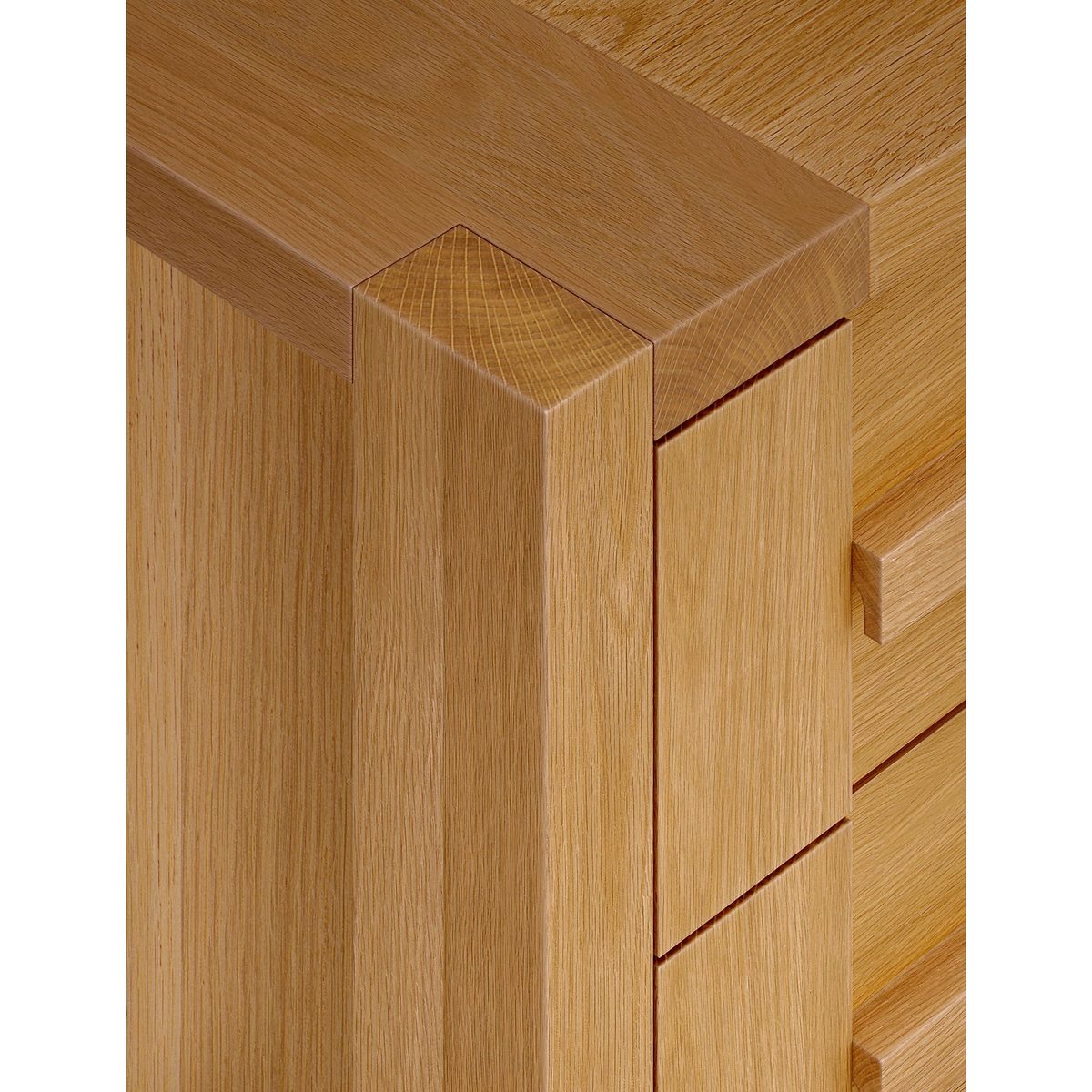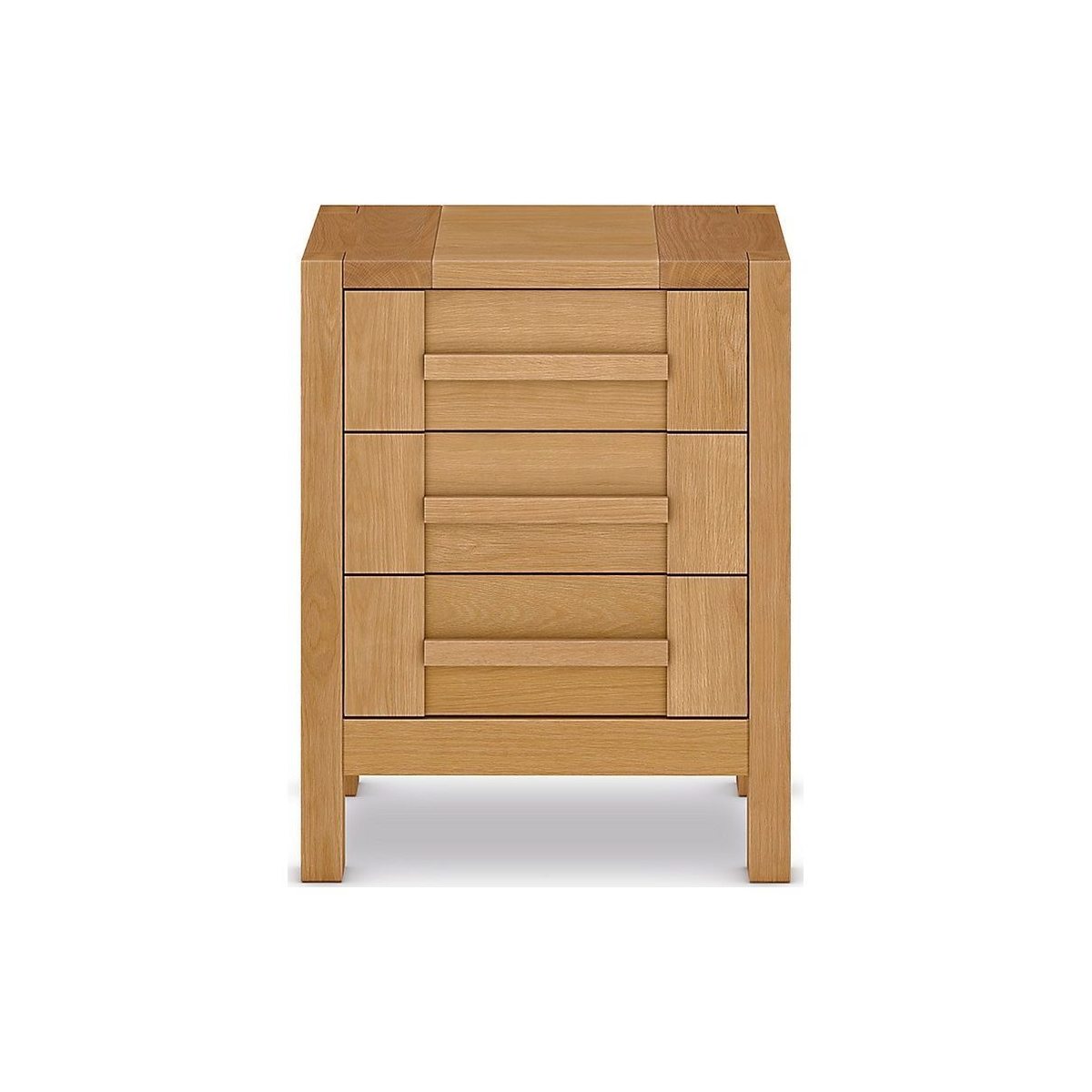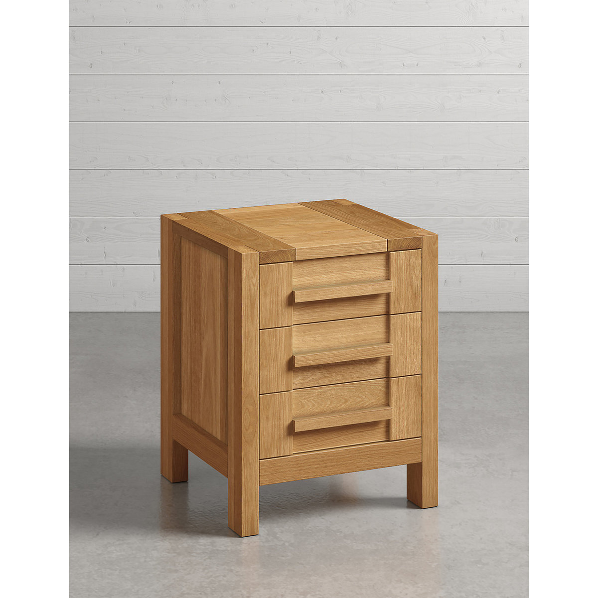 Expertly crafted from solid oak and oak veneer in our Plan A Eco Factory, we love this simple yet elegant bedside chest. A perfect stylish storage solution with the alluring hallmarks of wood, the wardrobe blends lighter tones with classic knotting, intricate grain detailing, and is finished with a sleek lacquer for added durability. This chest has three soft closing drawers and wooden handles that blend with the body for a tidy, modern look.