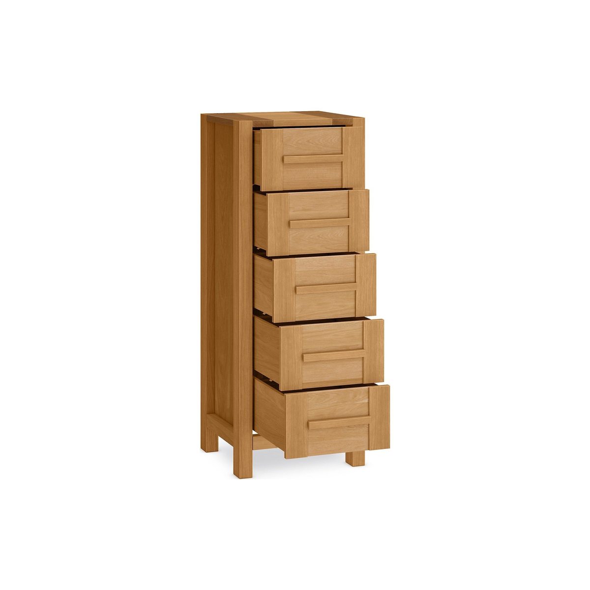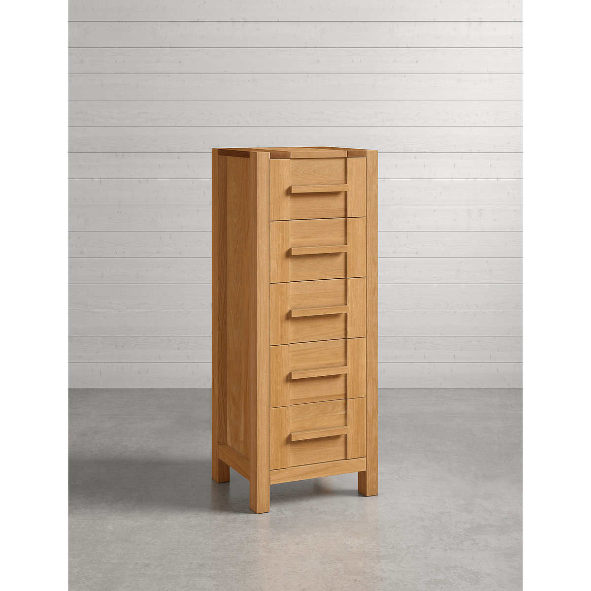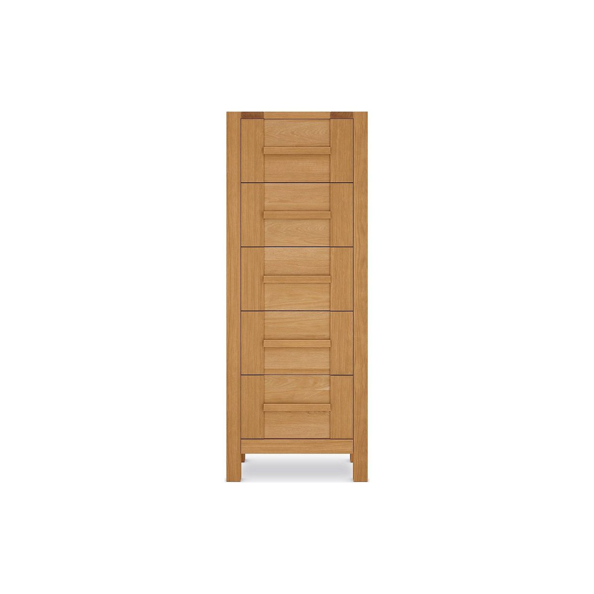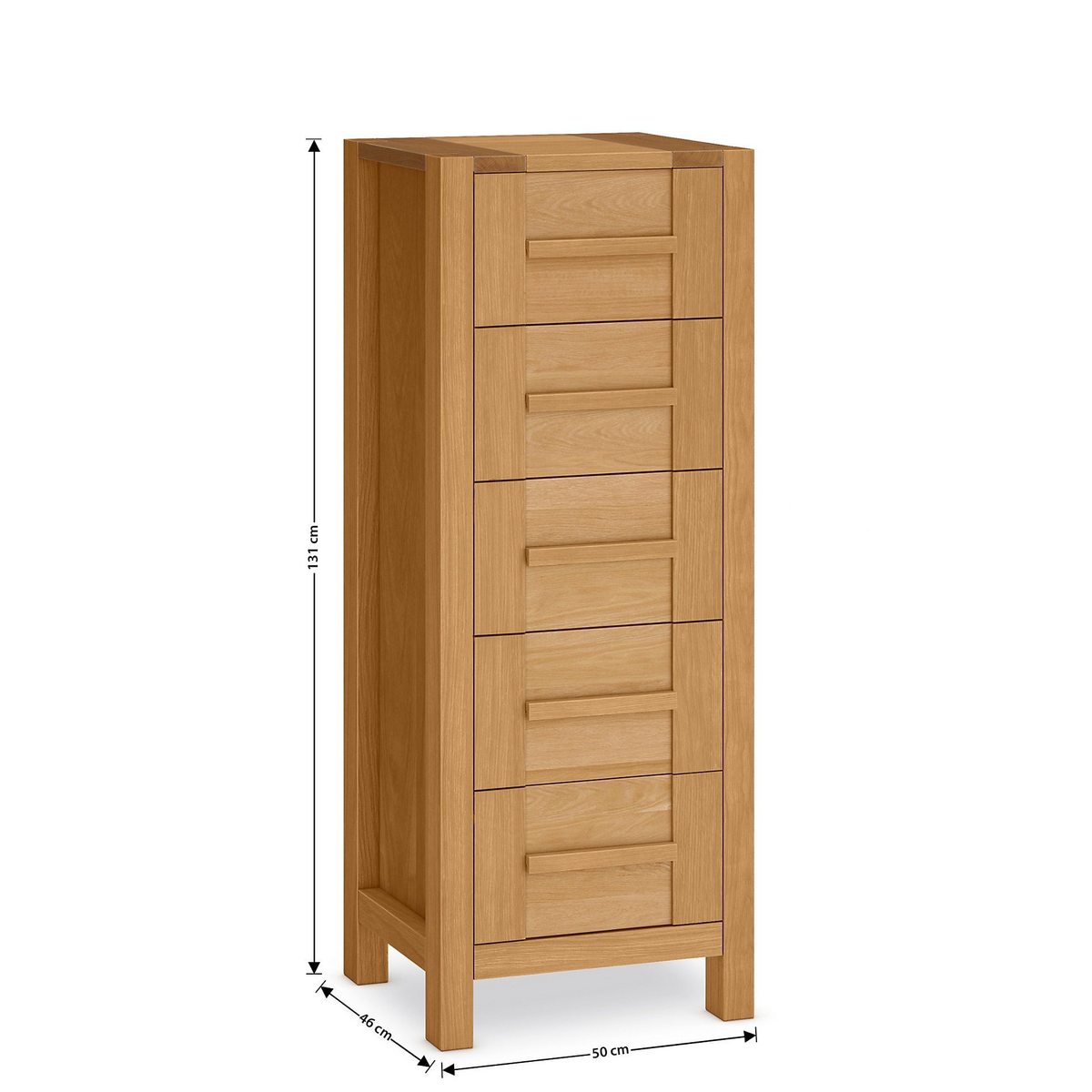 The Sonoma™ Tallboy is a beautifully crafted wardrobe, a perfect storage solution for any modern space. The five drawer wardrobe is crafted in our Plan A Eco Factory using sustainable oak and oak veneer and finished with a low-sheen lacquer for enhanced durability, so it brings your bedroom together for longer. Drawing the eye with its figured finish and framed neatly with dovetail joints, the wardrobe exhibits the classic characteristics of oak - from colour variation to knots to its intricate grain detailing. Standing legs and recessed sides reduce its profile, making it appear lighter and sleeker.