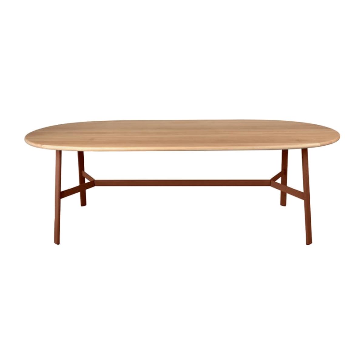 Table So'O by Fermob: Contemporary elegance for your living spaces The So'O table by Fermob embodies the essence of French design, where the art of entertaining meets artisanal excellence. A true centerpiece for any interior space, it perfectly blends the warmth of solid oak and the modernity of steel, for an aesthetic that is both sober and sophisticated. Exemplary French craftsmanshipDesigned and manufactured in France, the So'O is a testament to Fermob's unique craftsmanship. The carefully selected solid oak top rests on a steel Legs, guaranteeing sturdiness and durability. This harmonious blend of noble materials gives the Table a refined, timeless look, equally at home in a modern living room or a more traditional setting. Versatility and ergonomicsAvailable in two formats - rectangular (6 to 8 guests) and oval (9 to 10 guests) - So'O adapts to all reception configurations. The Tray's rounded edges offer a more comfortable seating experience, guaranteeing a welcoming space for every guest. The cross-shaped Legs, signature of the So'O range, provide optimum stability while adding a touch of visual originality. An assertive, long-lasting styleThe combination of Natural wood and colored steel Base, legs plays on contrasts. The contrast between the solid wood of the Tray and the colored steel legs creates a distinctive aesthetic, combining rustic charm with a touch of modernity, for a sophisticated, timeless style. The Table becomes a true decorative element, blending rusticity and modernity with finesse. Every detail is designed to stand the test of time, making the So'O a long-lasting investment that's both practical and aesthetically pleasing. Choose Fermob's So'O table and offer your guests the elegance of French design, a perfect fusion of tradition and innovation. In detail: Variation : Ochre red / Natural oak Brand : Fermob Designer :Studio Fermob Type : Oval table Colour : Legs : Ochre red - Tray : Natural oak Material : High-quality solid oak Tray (26 mm) - Cross Legs: Steel Dimensions : 220 x 95 cm x H 74 cm Weight : 103.4 lb Characteristics : 9 to 10 guests - Made in France - For indoor use only - High-quality Solid wood Show less
