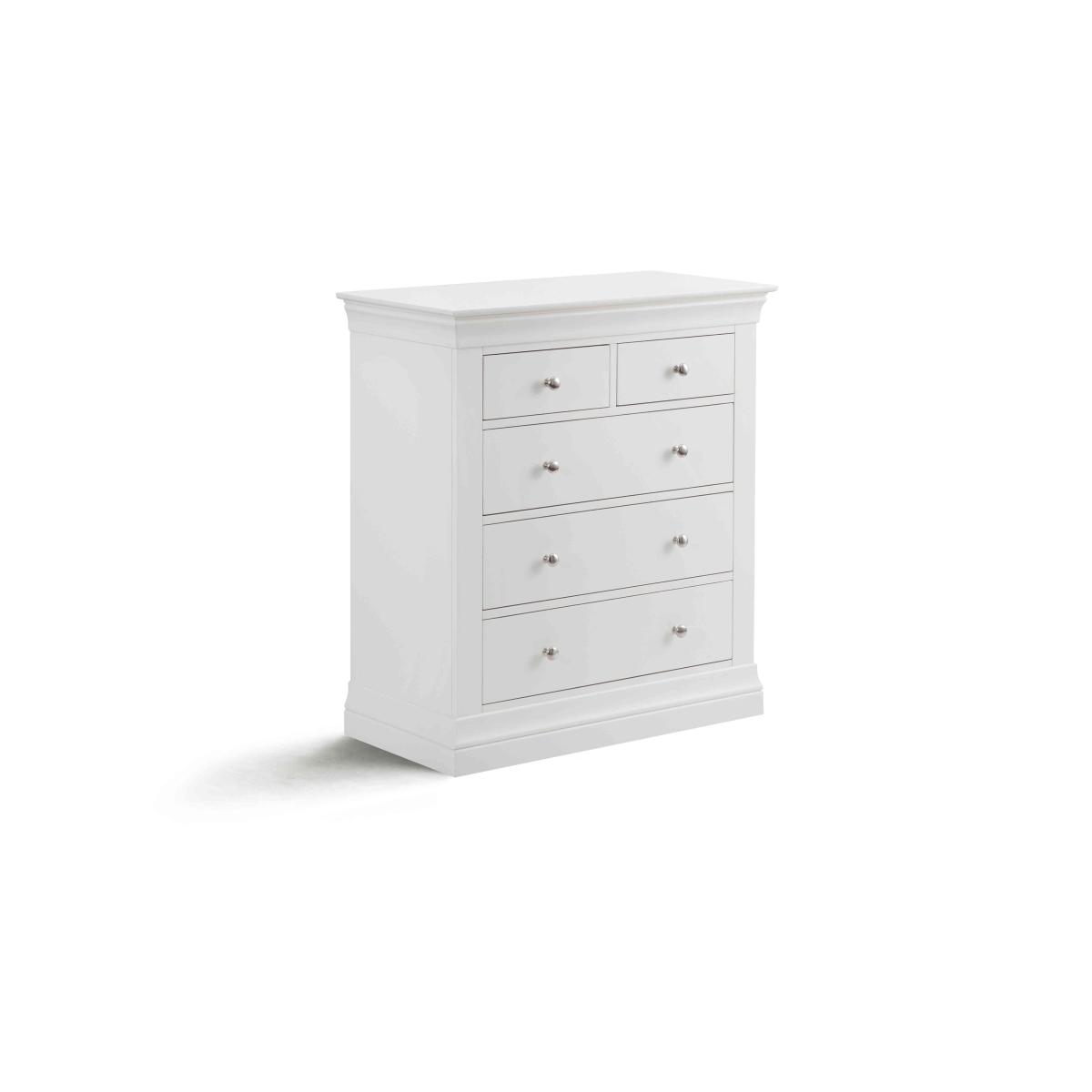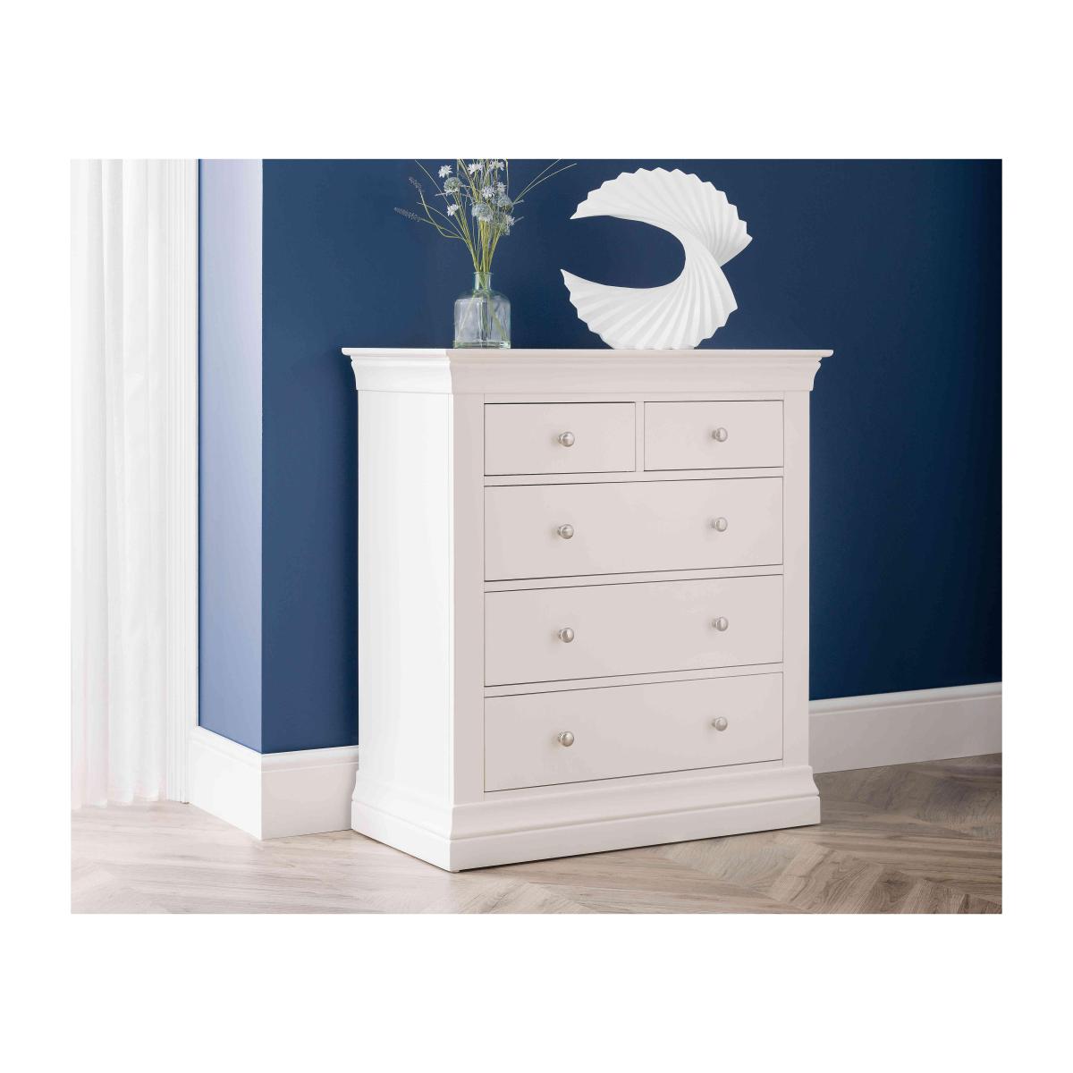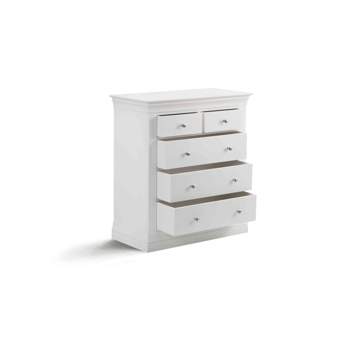 Drawing inspiration from classic French country furniture, the Sophia bedroom collection exudes contemporary chic. This refined look comes in two beautiful painted and lacquered finishes – fresh white and timeless grey – which complement both traditional and modern interiors. Expertly made with style and longevity in mind, the bedside cabinets, chests of drawers and wardrobe provide ample storage space. And just as beautiful is the gently curved bed frame, which will elevate any bedroom in an instant. With a limed oak-effect frame and sweeping linen-upholstered headboard, it makes a stunning impact. A timeless chest of drawers to elevate your bedroom interior. It looks great with classic and contemporary furniture. Why you'll love it This 3+2-drawer chest is chic and very practical. Beautiful French country style with a modern feel. Spacious drawers with brushed steel handles. Hardwearing painted and lacquered finish. Choice of colours – fresh white and soft grey. This 3+2-drawer chest is part of the Sophia range. What you need to know Natural wood surfaces may display knots, markings and colour variation. Painted finish is hardwearing but may chip if knocked. Dust with a lint-free cloth. Do not use silicon-based furniture polish. We recommend using placemats and coasters at all times. WARNING!