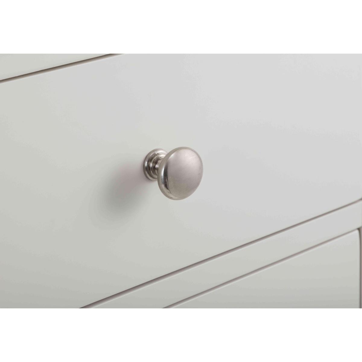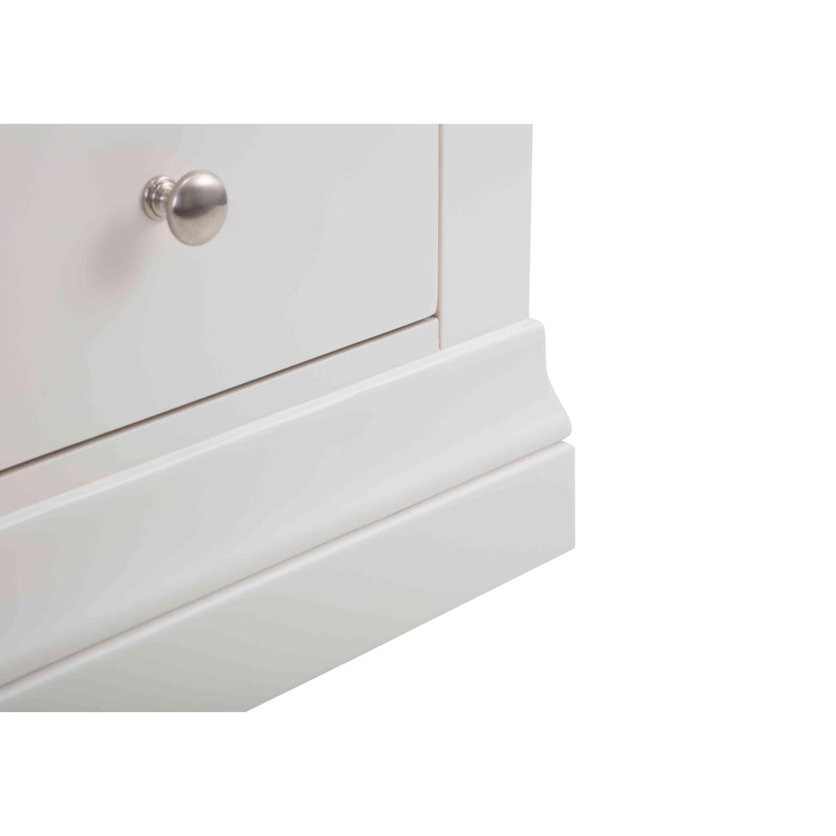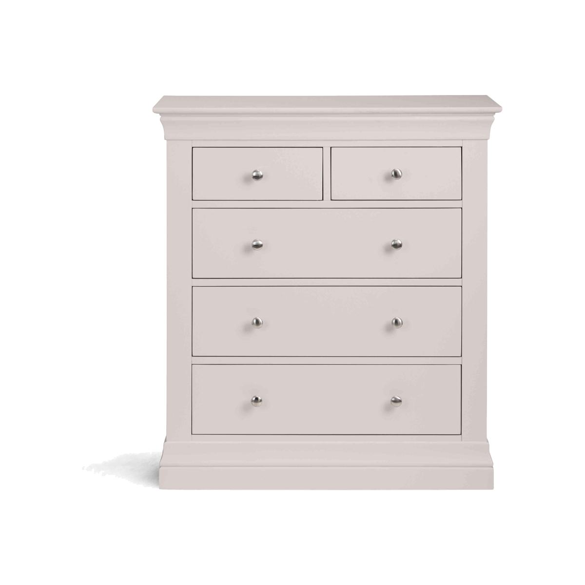 Drawing inspiration from classic French country furniture, the Sophia bedroom collection exudes contemporary chic. This refined look comes in two beautiful painted and lacquered finishes – fresh white and timeless grey – which complement both traditional and modern interiors. Expertly made with style and longevity in mind, the bedside cabinets, chests of drawers and wardrobe provide ample storage space. And just as beautiful is the gently curved bed frame, which will elevate any bedroom in an instant. With a limed oak-effect frame and sweeping linen-upholstered headboard, it makes a stunning impact. A timeless chest of drawers to elevate your bedroom interior. It looks great with classic and contemporary furniture. Why you'll love it This 3+2-drawer chest is chic and very practical. Beautiful French country style with a modern feel. Spacious drawers with brushed steel handles. Hardwearing painted and lacquered finish. Choice of colours – fresh white and soft grey. This 3+2-drawer chest is part of the Sophia range. What you need to know Natural wood surfaces may display knots, markings and colour variation. Painted finish is hardwearing but may chip if knocked. Dust with a lint-free cloth. Do not use silicon-based furniture polish. We recommend using placemats and coasters at all times. WARNING!