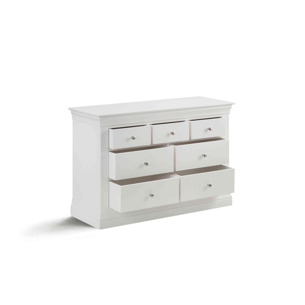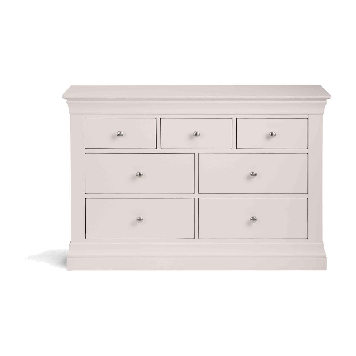 Drawing inspiration from classic French country furniture, the Sophia bedroom collection exudes contemporary chic. This refined look comes in two beautiful painted and lacquered finishes – fresh white and timeless grey – which complement both traditional and modern interiors. Expertly made with style and longevity in mind, the bedside cabinets, chests of drawers and wardrobe provide ample storage space. And just as beautiful is the gently curved bed frame, which will elevate any bedroom in an instant. With a limed oak-effect frame and sweeping linen-upholstered headboard, it makes a stunning impact. This gorgeous chest of drawers is a refined take on bedroom storage. Its top is the perfect place to display precious photos and trinkets. Choose grey or white. Why you'll love it This 4+3-drawer chest is both stunning and practical. Beautiful French country style with a contemporary feel. Spacious drawers with brushed steel handles. Hardwearing painted and lacquered finish. Choice of colours – fresh white and soft grey. This 4+3-drawer chest is part of the Sophia range. What you need to know Natural wood surfaces may display knots, markings and colour variation. Painted finish is hardwearing but may chip if knocked. Dust with a lint-free cloth. Do not use silicon-based furniture polish. We recommend using placemats and coasters at all times. WARNING!