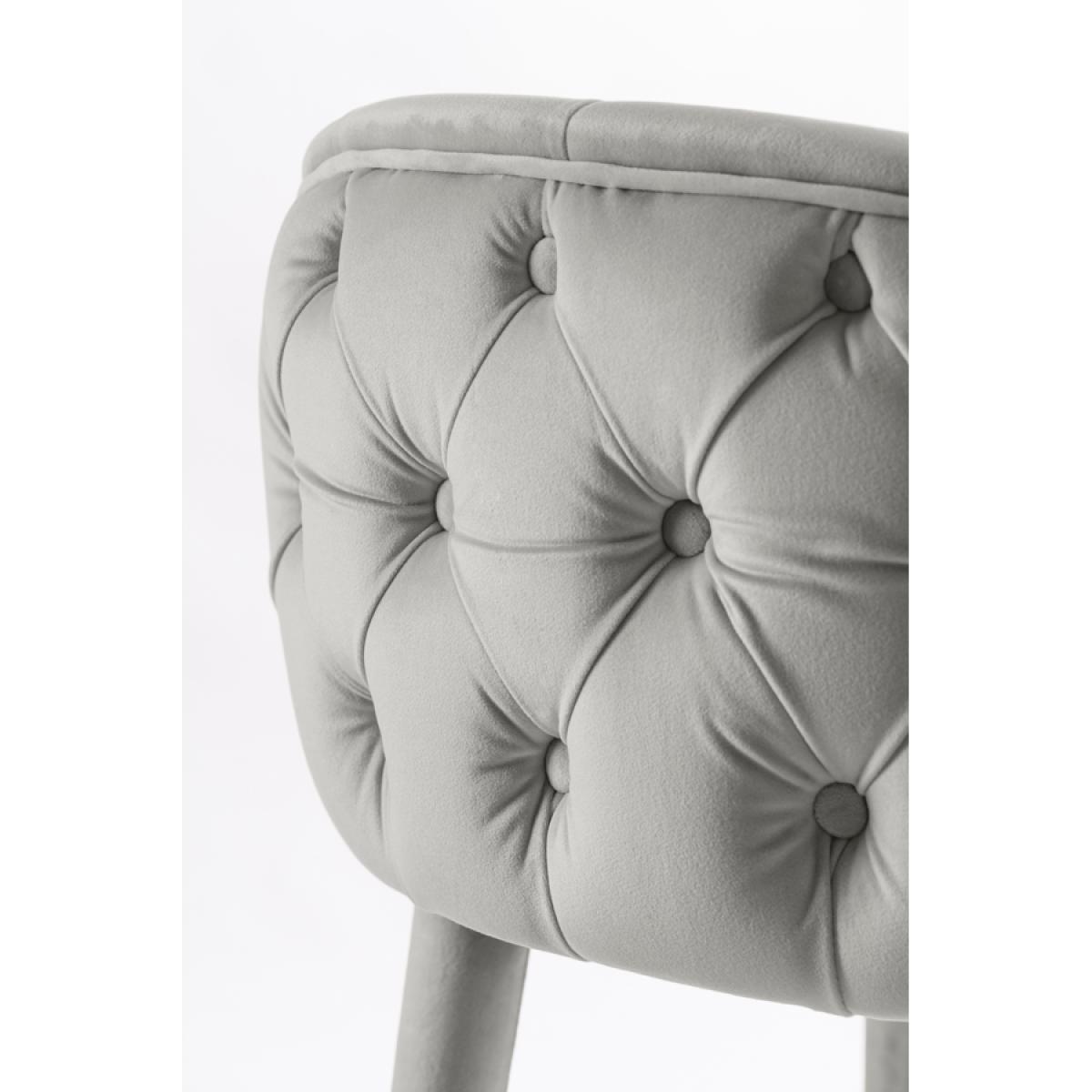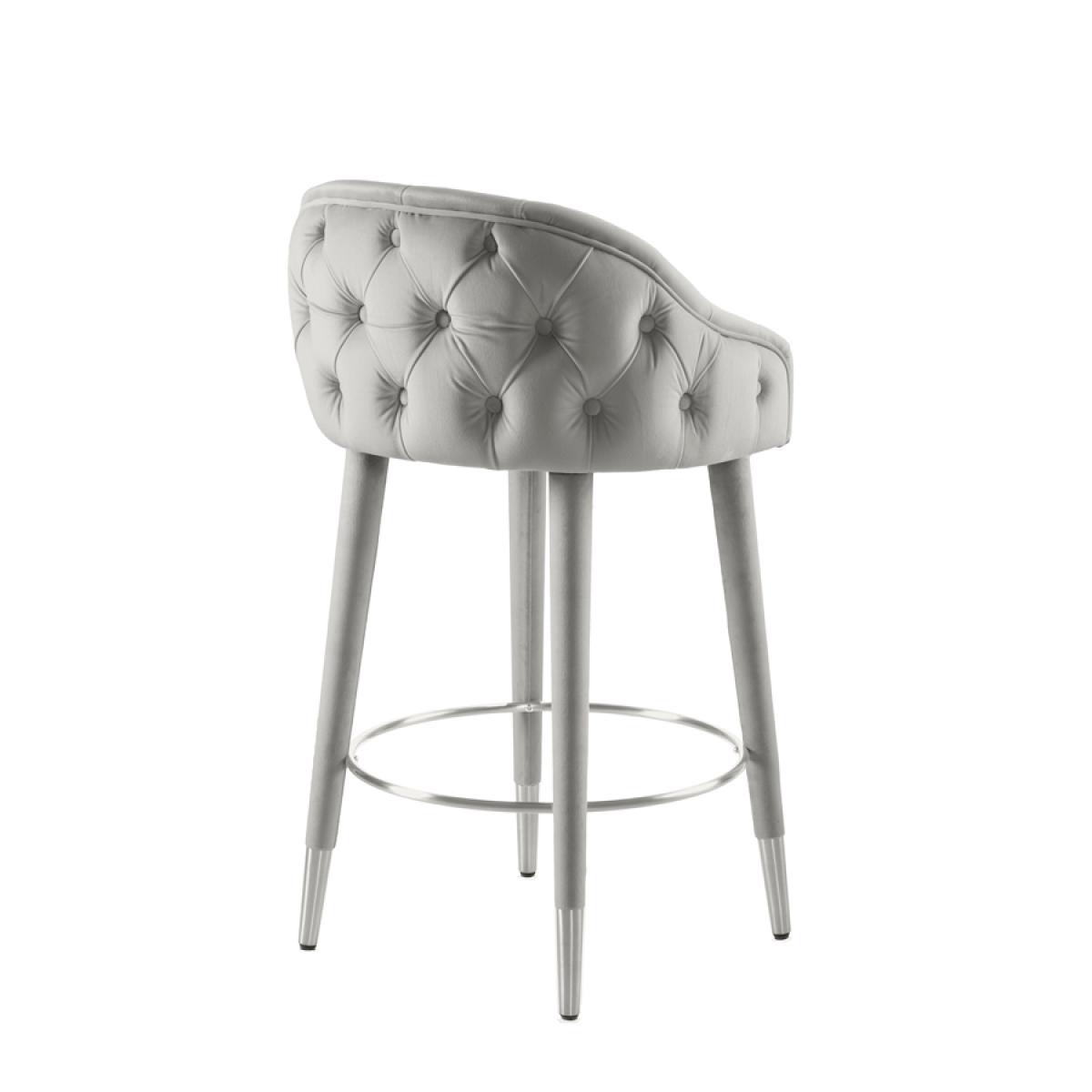 A skilfully handcrafted, deep buttoned counter stool with an elegant flowing form. Ideal in height for use at standard breakfast bars. Upholstered legs with brushed stainless steel caps give this stool a pretty, feminine feel. Sprung base with comfortable deep foam and fibre filling. Velvet upholstery fabric. Simple assembly required, approximately 10 minutes.