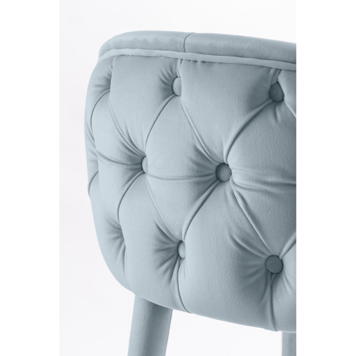 I love this stool for adding a pop of colour and a contemporary touch to a variety of interiors. Its powder blue hue pairs beautifully with neutral schemes, making it ideal for kitchens or breakfast bars that require a subtle colour boost. The brass caps on the legs add a touch of sophistication and can help tie in metallic accents elsewhere in the room. It works well in both modern and vintage-inspired spaces, especially when combined with plush fabrics or natural textures. For practical styling, consider pairing this with a minimalist counter or use it as an occasional seat in a more eclectic lounge setup. Its compact size and inviting shape also make it a versatile choice for smaller homes or open-plan areas.
