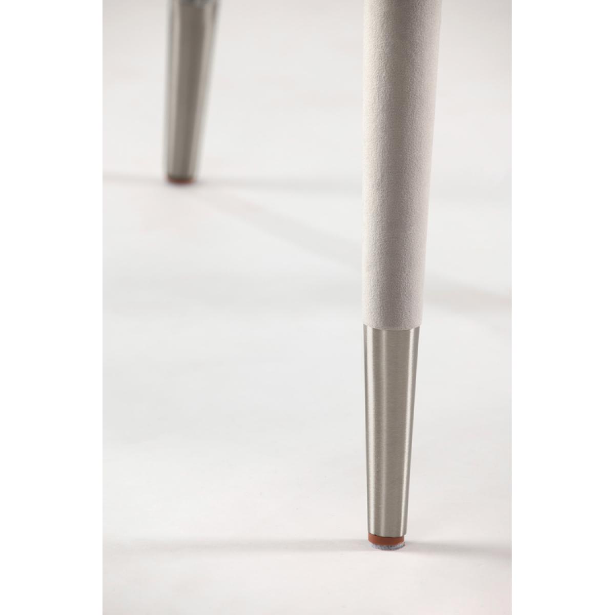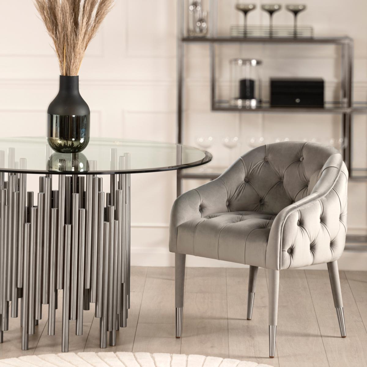 I’m a fan of this grey velvet dining chair thanks to its clean, button-tufted back and subtle silver leg caps - it feels both modern and approachable. It slips easily into Scandi-inspired schemes when paired with pale wood, or into a more contemporary look alongside darker woods and metal accents. For styling, tuck it under a round glass or white marble table to keep the space feeling light, or mix with a rich oak table for a smarter contrast. A neutral sheepskin draped over the seat adds warmth and texture, while coordinating metal or ceramic tableware will tie the silver details back into the scheme.