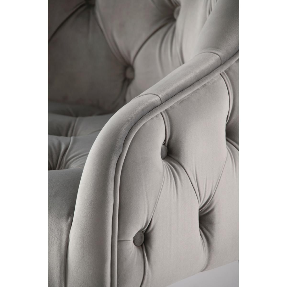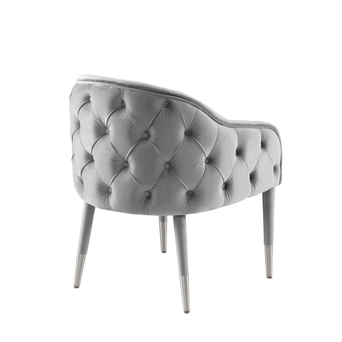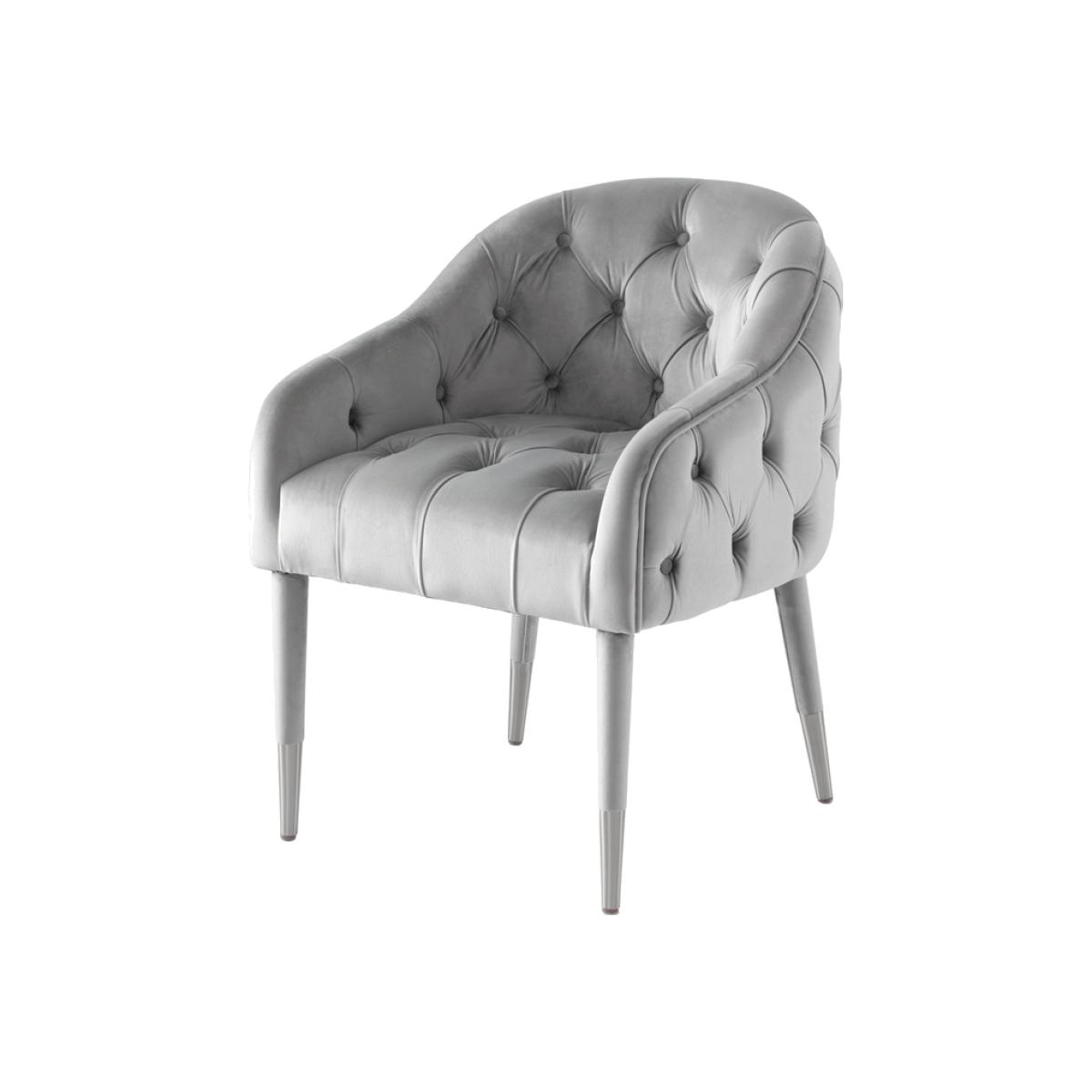 A skilfully handcrafted deep buttoned chair with an elegant flowing form. Upholstered legs with brushed stainless steel caps give this chair a pretty, feminine feel. Sprung base with comfortable deep foam and fibre filling. Velvet upholstery fabric. Simple assembly required, approximately 10 minutes.