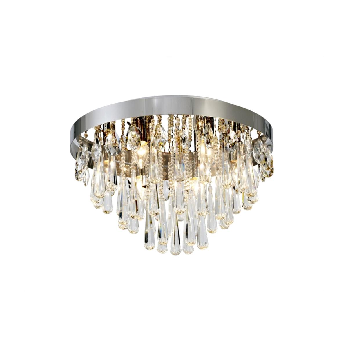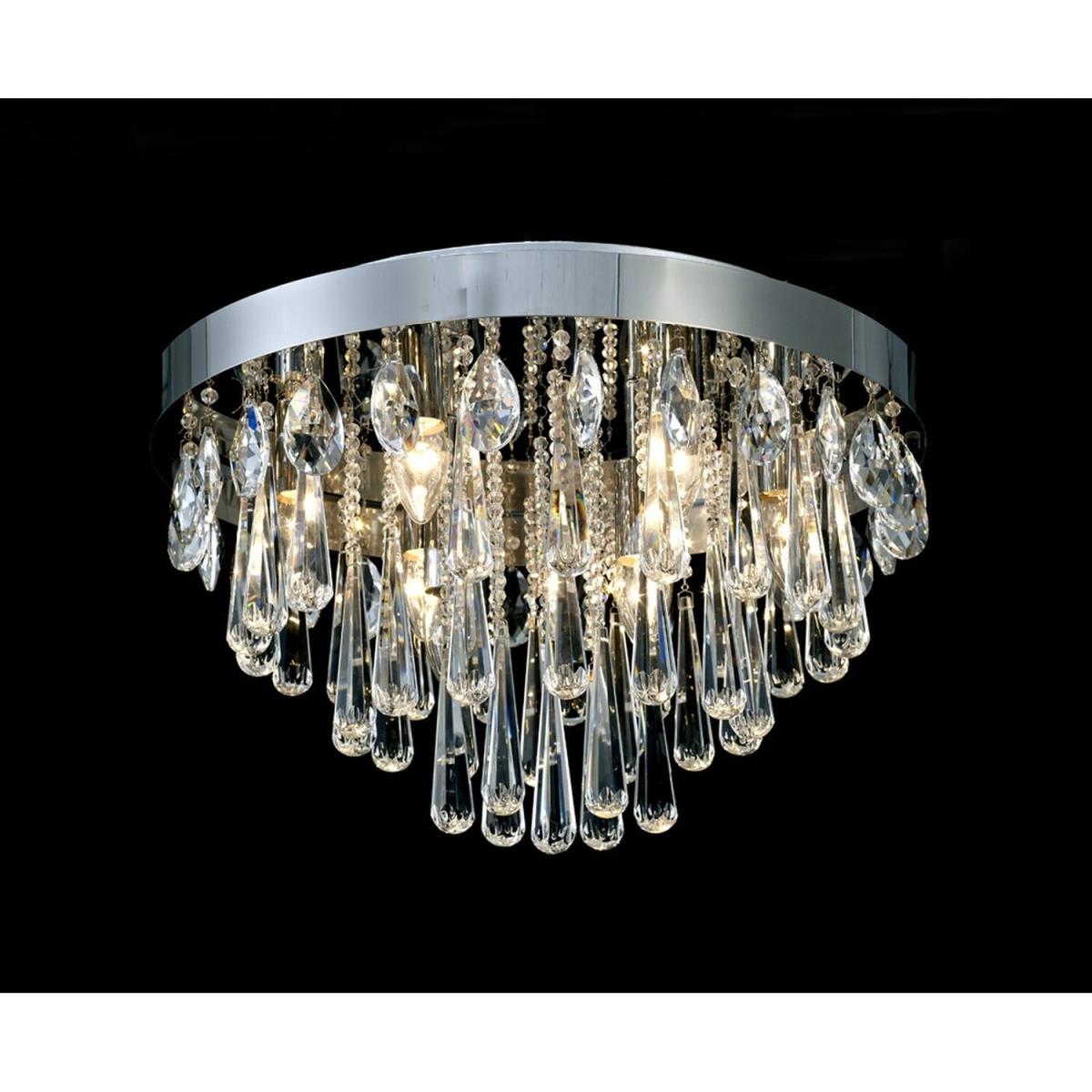 This is a remarkable crystal chandelier introducing a dramatic new crystal cut. The ceiling lights are available as both pendant and flush fittings in two sizes. The centre of the pendant fixtures feature a wide circular Polished Chrome frame that visually separates the impressive crystal drops from the strings of crystal beads draping from the metal ring at the top of the fixture. In order to maximise the effect from the crystal beads lamp holders have not only been placed behind the crystal drops but are also situated in the upper half of the pendant fixtures. The eye catching large rain drop crystals are also suspended on strands of crystal beads providing greater depth and presence. The corresponding wall lamp in this collection would make an impressive lone feature as its design reflects that of the chandelier.