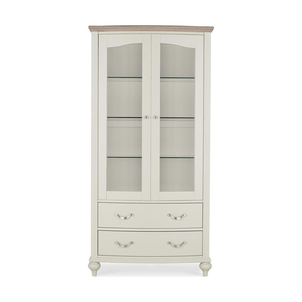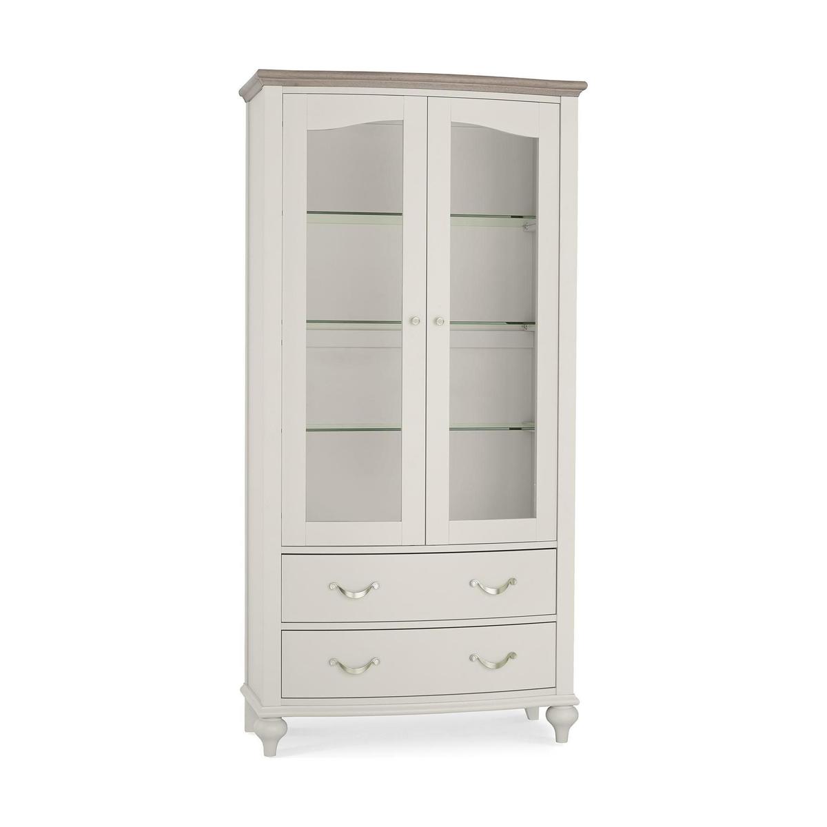 Designed with a double door cupboard, three glass shelves and two large drawers, this display cabinet features rounded legs and curved metal handles. Crafted from soft grey painted solid beech wood, this cabinet boasts an oak and oak veneer grey washed top.
