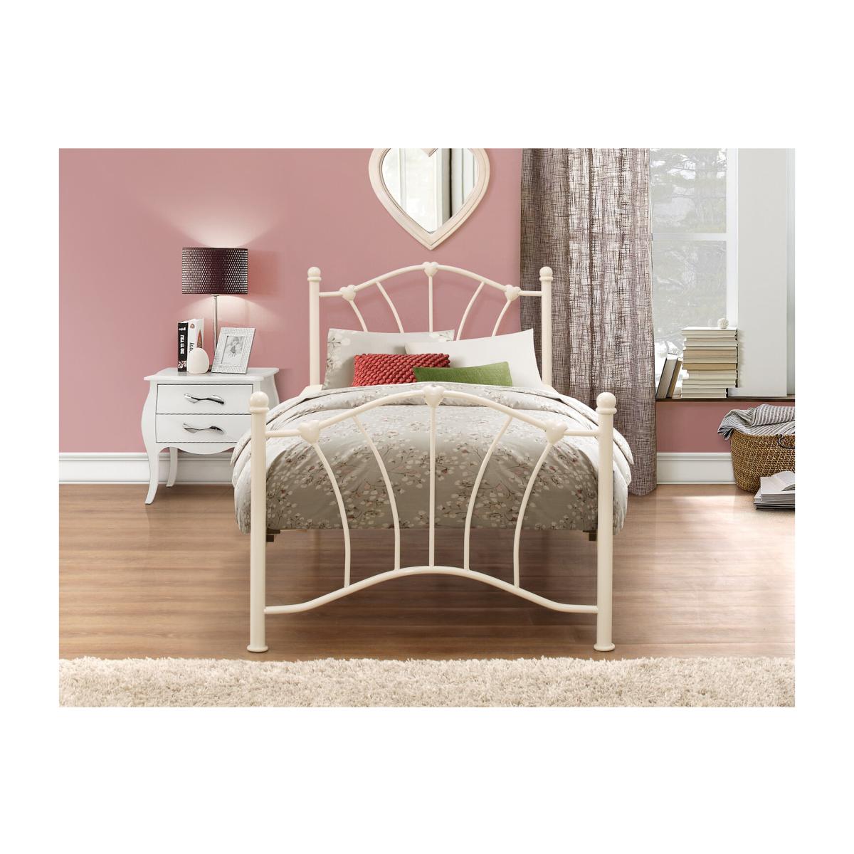 A wonderful children's bed, the Sophia Single Cream Bed features beautiful heart castings and a soft powder-coated finish to add real elegance to the room. The steel frame features curved top rails with a cream finish with a sprung slatted base to give a natural bounce, adjusting to where pressure is most exerted to provide greater comfort. Finished with heart-shaped details, this is a beautiful addition to your child's bedroom.