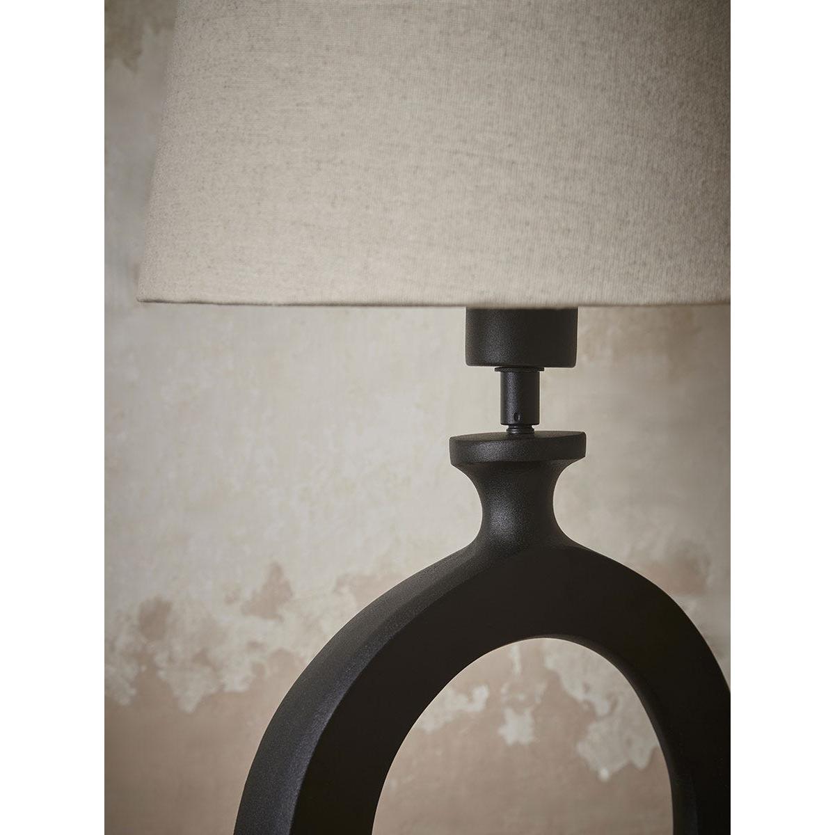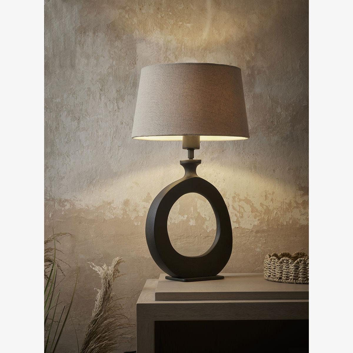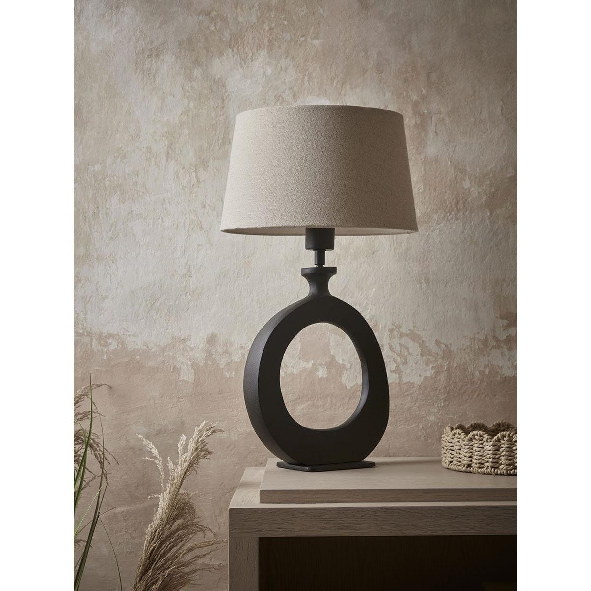 Light your home and create an interesting focal point with our Sophia Table Lamp. Crafted in a striking black, the circular abstract base has an organic sculptural quality to it, contrasting beautifully with the neutral shade for a wonderful eye-catching detail that adds a cosy and warming atmosphere to your home.  Discover how to create the perfect lighting scheme for your home using our Lighting Buying Guide.