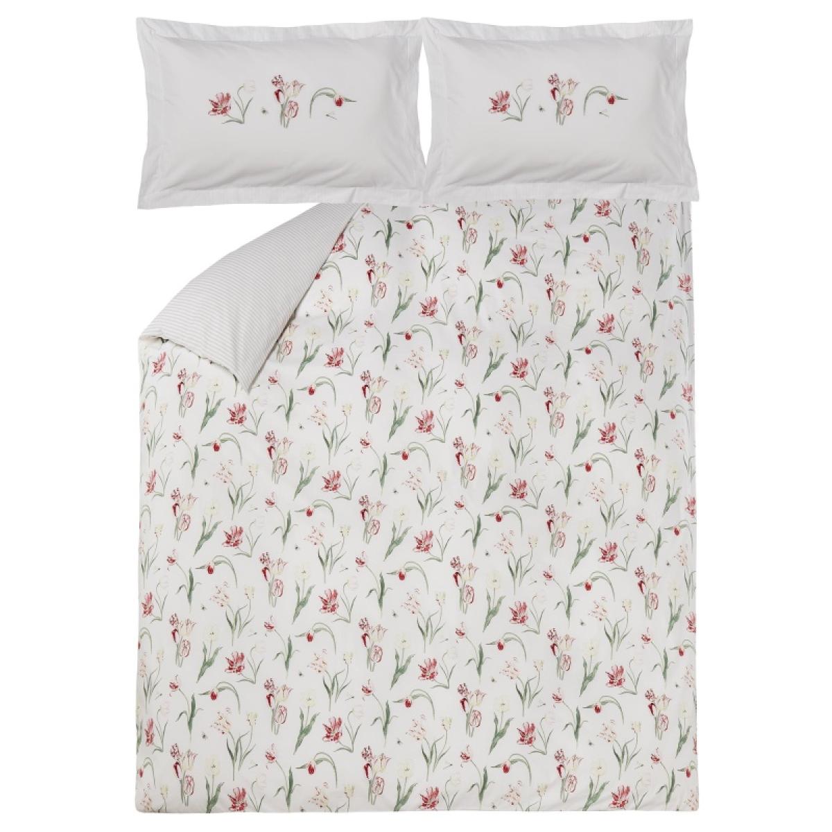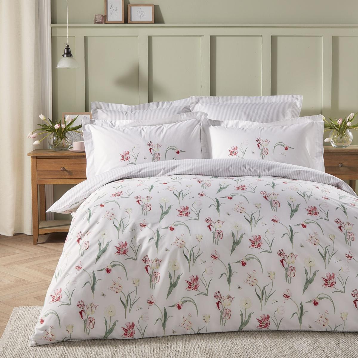 Refresh Your Main Bedroom or Guest Room for the Spring/Summer Season with the exquisite 100% Cotton Percale Sophie Allport Tulips Bedding! Embrace elegance and comfort with this luxurious bedding featuring a reversible design: delicate tulips on one side and a soothing soft grey stripe on the other. Designed to effortlessly complement white, grey, or neutral bedroom decor, this set offers a statement style that exudes calmness and relaxation. Crafted from 200 thread count cotton percale, each piece promises premium quality and comfort. Enhance your bedding ensemble further with additional pillowcases available for separate purchase in sets of two. Elevate your sleep experience with this timeless bedding set, perfect for welcoming each day with tranquility and style Features 100% cotton 200 thread count Reversible design Single Duvet Includes Single Pillowcase Double, King and Superking Size Duvet Includes Pair of Pillowcases Care Instructions Wash at 40 degrees Wash dark colours separately Tumble dry on low For best results iron whilst damp on a warm setting Do not bleach Do not dry clean Please note All screens vary in colour reproduction and whilst every effort has been made to display the colour as accurately as possible it is for guidance only.