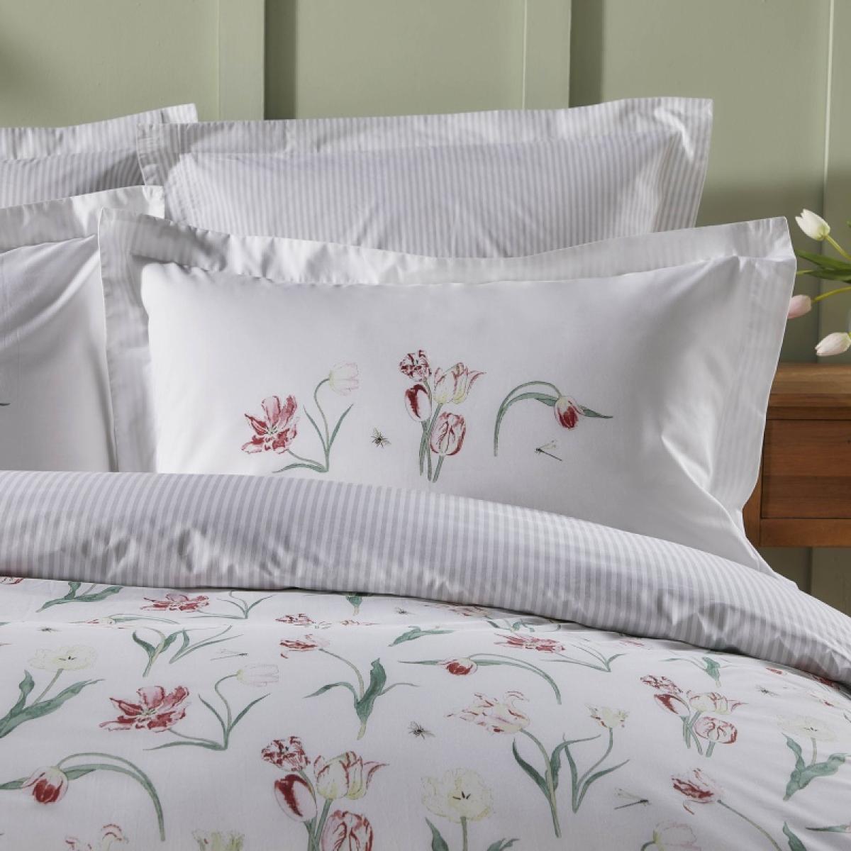 Refresh Your Main Bedroom or Guest Room for the Spring/Summer Season with the exquisite 100% Cotton Percale Sophie Allport Tulips Bedding! Embrace elegance and comfort with this luxurious bedding featuring a reversible design: delicate tulips on one side and a soothing soft grey stripe on the other. Designed to effortlessly complement white, grey, or neutral bedroom decor, this set offers a statement style that exudes calmness and relaxation. Crafted from 200 thread count cotton percale, each piece promises premium quality and comfort. Enhance your bedding ensemble further with additional pillowcases available for separate purchase in sets of two. Elevate your sleep experience with this timeless bedding set, perfect for welcoming each day with tranquility and style Features 100% cotton 200 thread count Reversible design Single Duvet Includes Single Pillowcase Double, King and Superking Size Duvet Includes Pair of Pillowcases Care Instructions Wash at 40 degrees Wash dark colours separately Tumble dry on low For best results iron whilst damp on a warm setting Do not bleach Do not dry clean Please note All screens vary in colour reproduction and whilst every effort has been made to display the colour as accurately as possible it is for guidance only.
