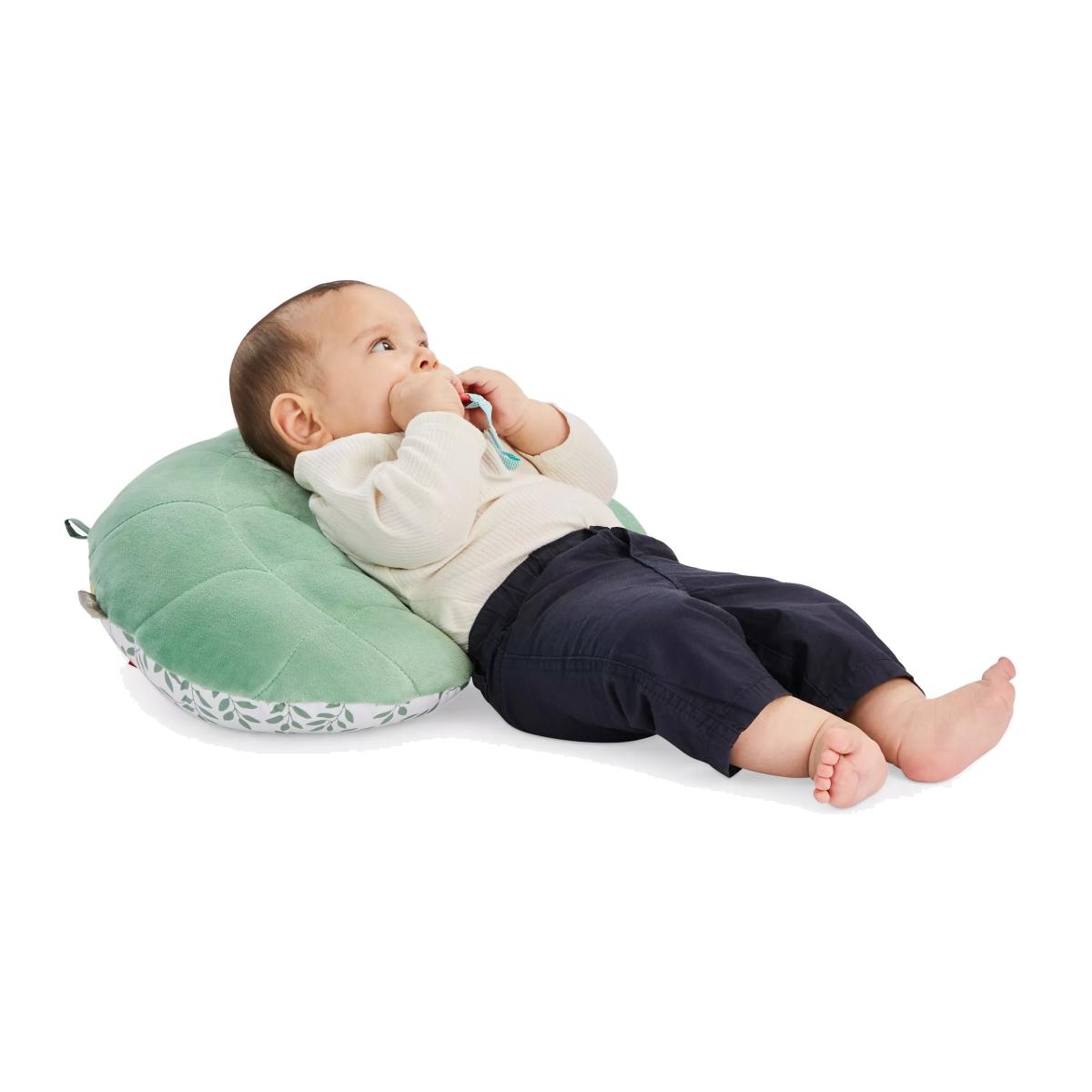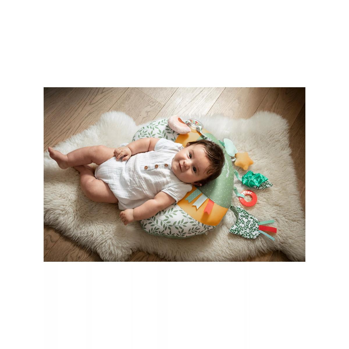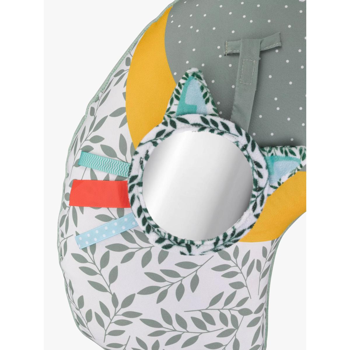 A reversible activity pillow to accompany baby throughout the day! It comes with 2 positions to evolve with of baby's growth! On the stomach, baby discovers many activities, while strengthening the muscles of his neck and back. Sitting, the cushion can be placed on the baby's lap thanks to its ergonomic shape. It features a multitude of activities to explore to awaken baby's senses: a teething ring, a transparent rattle, a mirror, leaves with a funny crumpled paper sound, and different textures. On the relaxation side, with its rounded and ergonomic shape, the cushion envelopes baby and offers him an ideal relaxation space after feeding, to facilitate baby's digestion. Safety information: - Do not let the child sleep in the product.