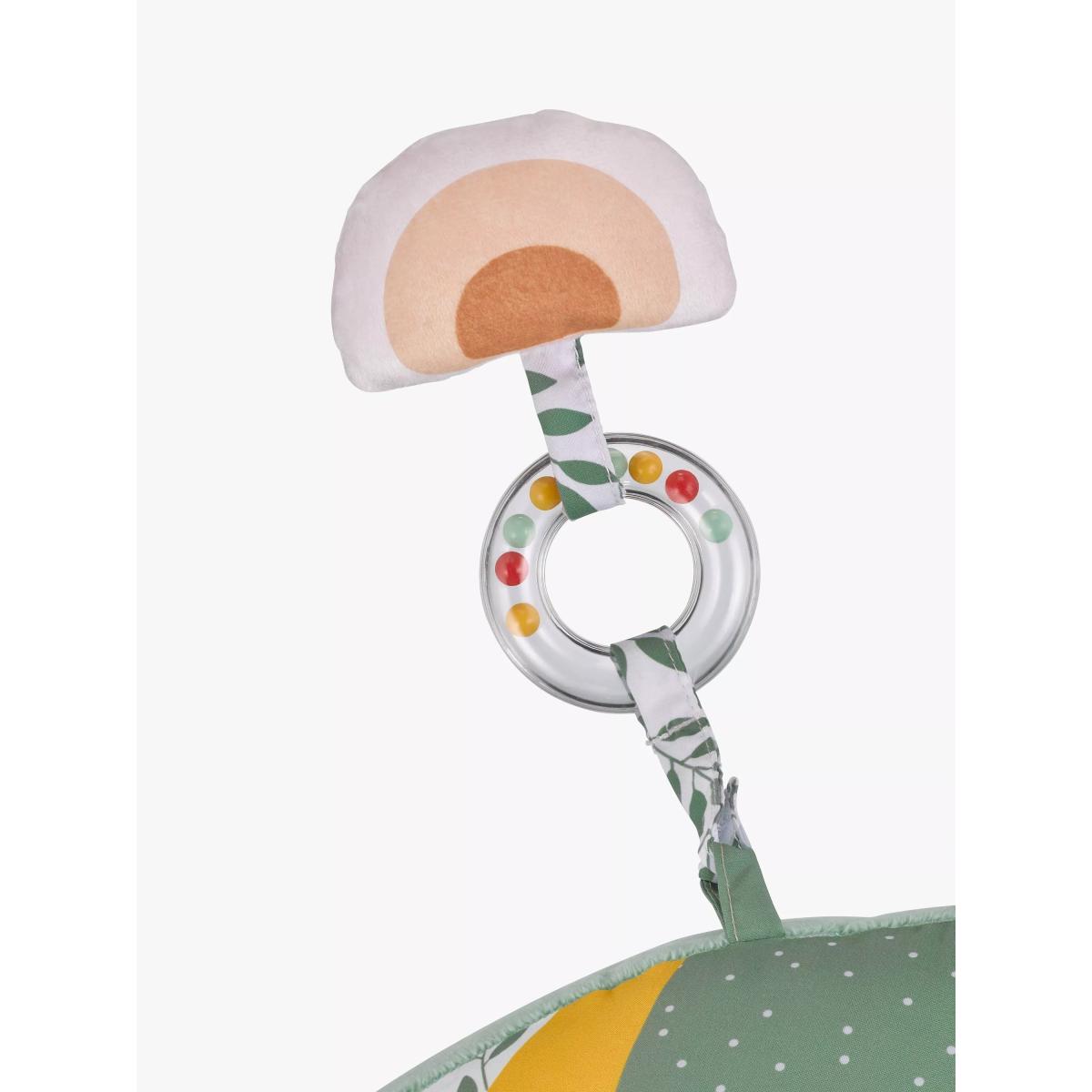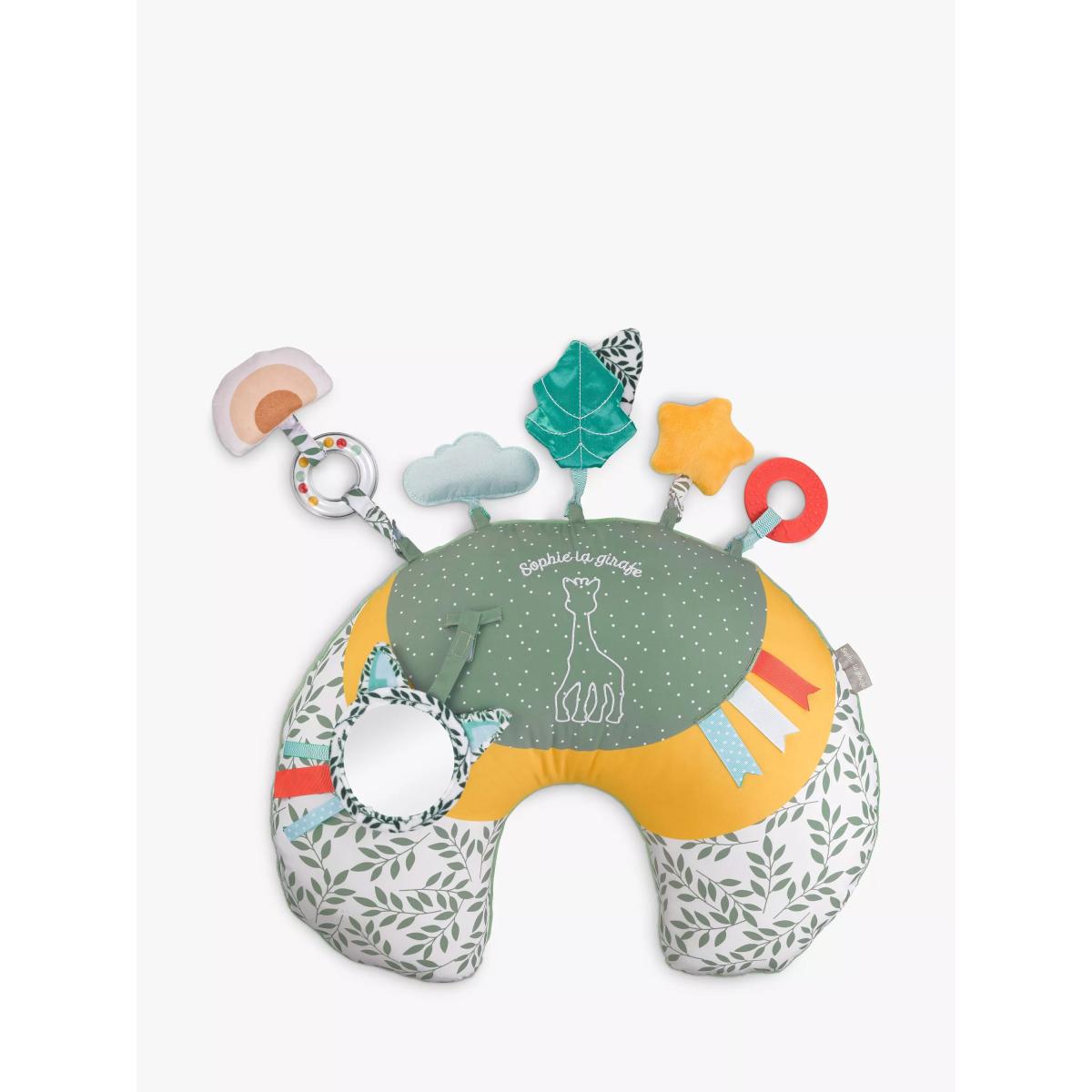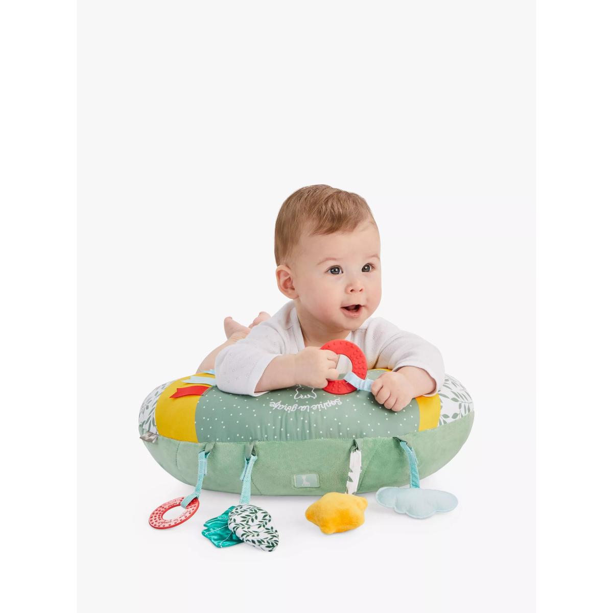 A reversible activity pillow to accompany baby throughout the day! It comes with 2 positions to evolve with of baby's growth! On the stomach, baby discovers many activities, while strengthening the muscles of his neck and back. Sitting, the cushion can be placed on the baby's lap thanks to its ergonomic shape. It features a multitude of activities to explore to awaken baby's senses: a teething ring, a transparent rattle, a mirror, leaves with a funny crumpled paper sound, and different textures. On the relaxation side, with its rounded and ergonomic shape, the cushion envelopes baby and offers him an ideal relaxation space after feeding, to facilitate baby's digestion. Safety information: - Do not let the child sleep in the product.