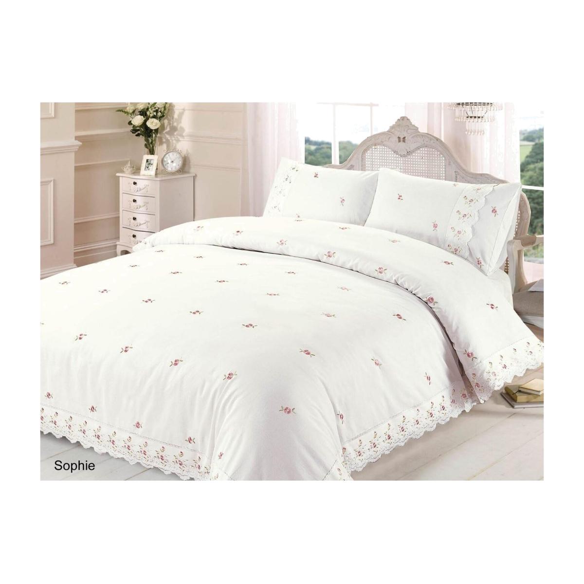 Add some classic elegance to your bedroom with this vintage inspired Sophie Lace Embroidered Duvet Cover Set. This gorgeous duvet cover set flaunts an abundance of intricate delicately embroidered pink rosebuds across a cream duvet cover, and is finished with a broderie anglaise lace trim. The stunning design and elegant lace trim are carried over to the matching pillow cases. Guaranteed to add a feminine touch to your room, the elegant finely crafted embellished bed linen set is pretty and charming with its special detailing. The timeless bed linen set is made from a combination of fine cotton and polyester to give an easy care fabric that is both beautifully smooth to sleep upon and extremely long lasting.