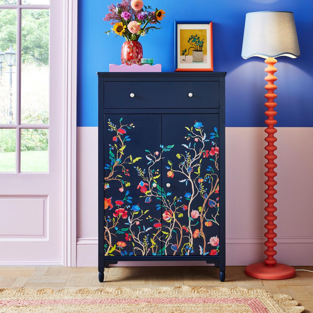 Sophie Robinson Branded Unique Printed Floral Design Adjustable Bottom Shelf This units unique printed floral design brings a burst of joy and personality to any hallway, instantly brightening up your home. This versatile piece is also ideal to be used as a drinks cabinet. Crafted with practicality in mind, the unit features an adjustable bottom shelf, offering flexibility to store shoes, bags, or decorative items.