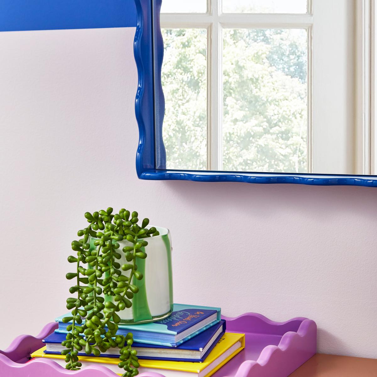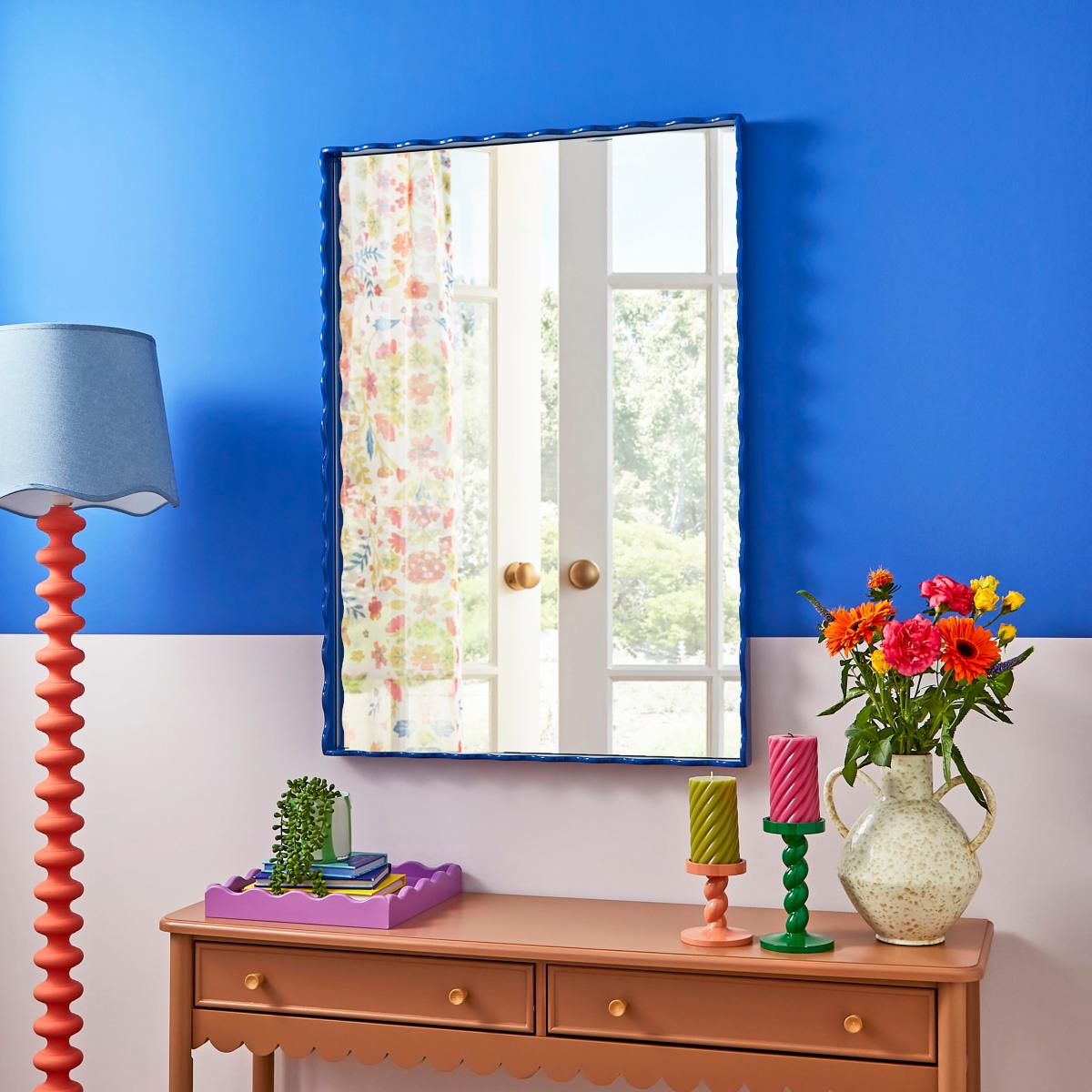 * Interesting wiggle design* Vivid and bright colourways* Rectangular shape* Choice of sizes Bring light and space to your room with this rectangular wall mirror from Sophie Robinson. With a fun wiggle design, the gloss finish and bright colourways work together to create an impactful statement piece. Great for over dressers or chests of drawers, this is a lovely way to bring colour into your home. There is a choice of size to best suit your space. Please note: this mirror is not suitable for use in bathrooms.