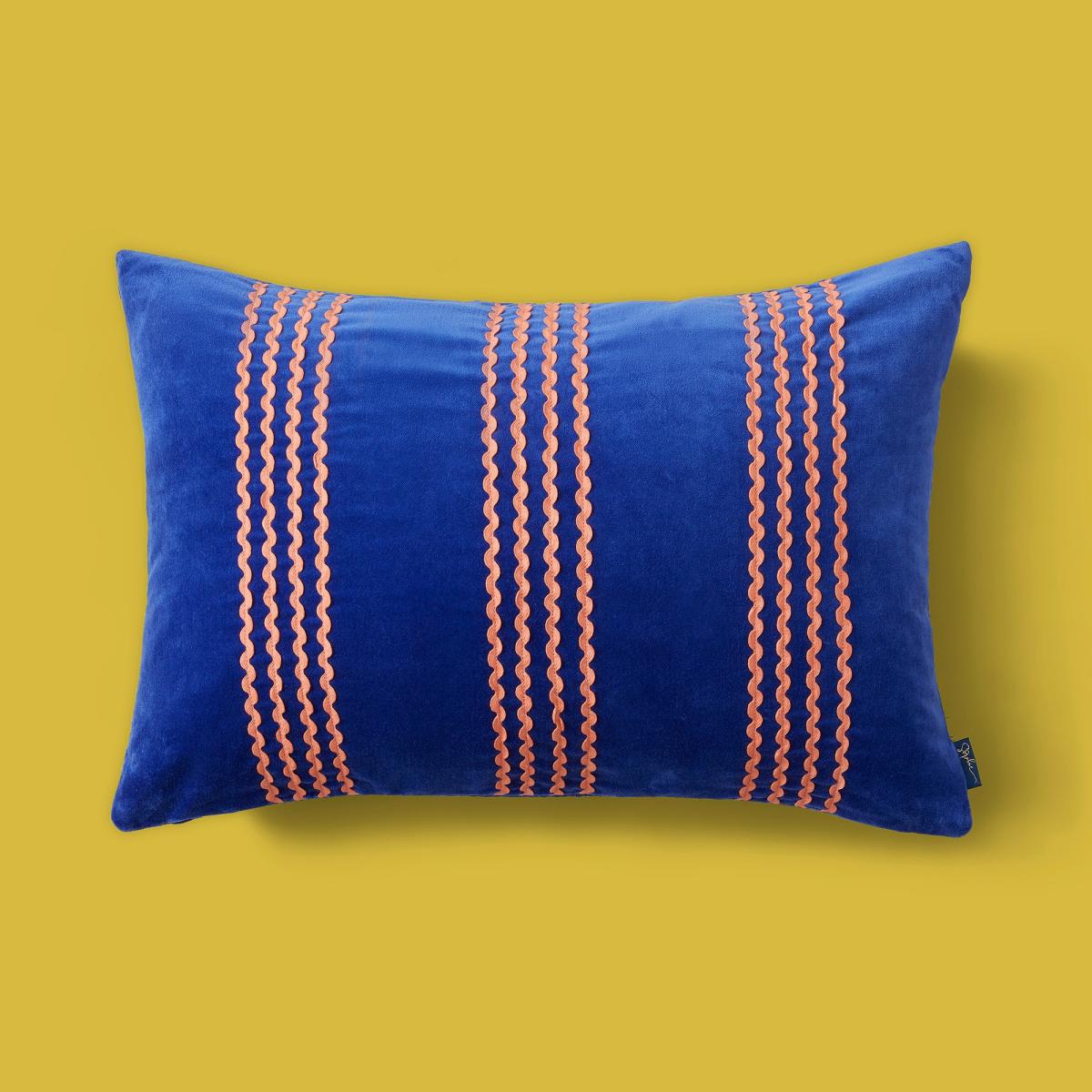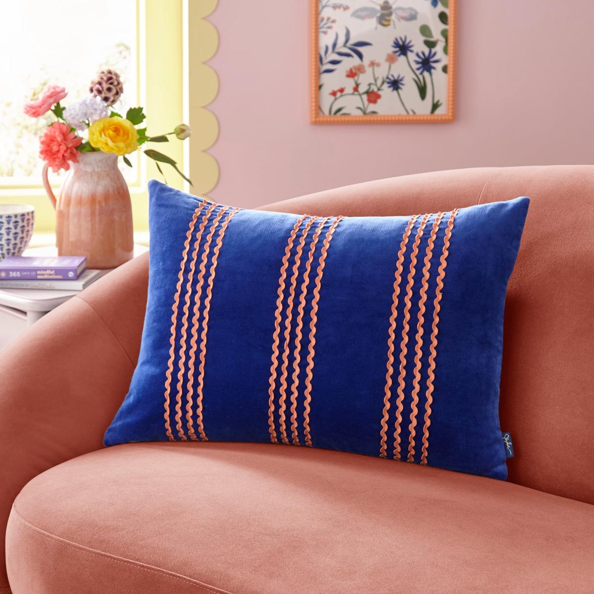 I love this sofa cushion for its bold Ric Rac stripe design, which adds a playful yet structured element to any space. It works particularly well in contemporary or Scandinavian interiors where clean lines are key, but it can also bring a touch of personality to more traditional settings. For practical styling, pair it with plain cushions in complementary shades, like soft neutrals or muted pastels, to let the stripe pattern stand out without overwhelming the space. It’s perfect for adding a pop of colour and pattern to sofas or armchairs, and because of its rectangular shape, it provides a versatile alternative to the usual square cushions.