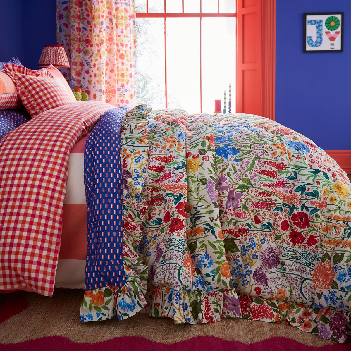 * Sophie Robinson branded* 100% Cotton Percale* Bold Floral design* Machine Washable* Corresponding items available Bring bold vibrancy to your bedroom with the Sophie Robinson Sunshine Flowers Bedspread. Its lively floral print, paired with a contrasting reverse, creates an eye-catching focal point while offering versatile styling. Crafted from soft, breathable 100% cotton percale, this reversible bedspread is perfect for layering during any season. A decorative frilled edge adds an elegant finishing touch, completing the look with playful sophistication.