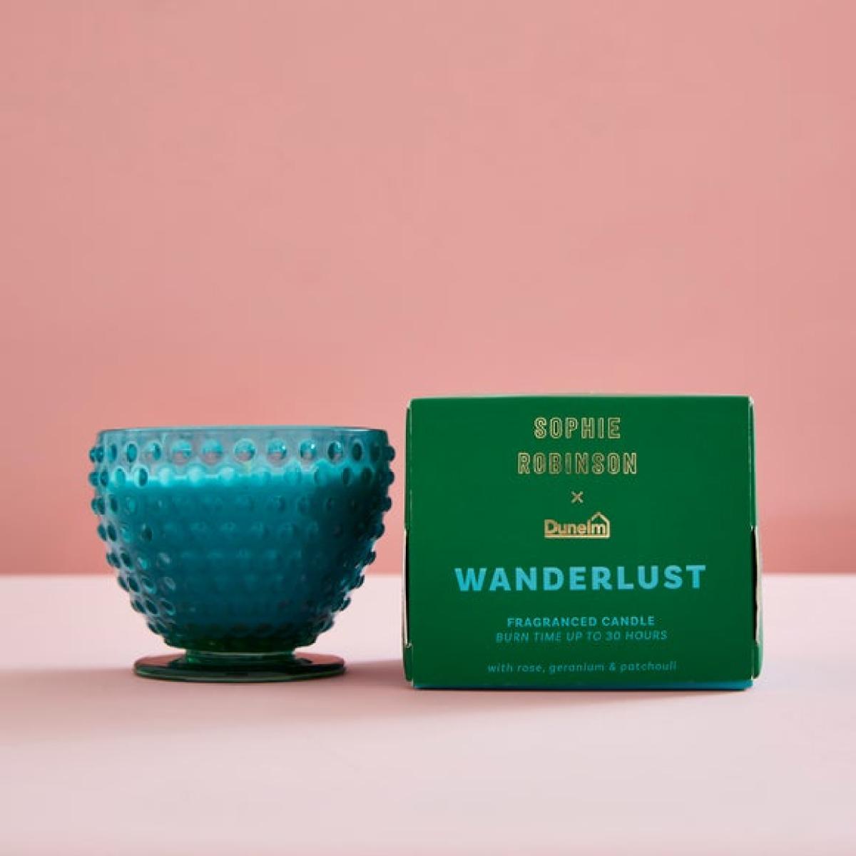 * Decorative peacock green vessel * Contrasting green base * Textured dot pattern * Deep floral scent * Burns up to 30 hours Add a touch of bold glamour to your space with the Sophie Robinson Wanderlust Candle. This rich blend of rose, geranium and patchouli creates a warm, intriguing scent that lingers beautifully. Housed in a peacock green glass vessel with a textured dot pattern and contrasting green base, it’s great for adding a splash of colour to your decor. With up to 30 hours of burn time, it’s perfect for evenings that call for a little escapism. Let the scent transport you somewhere unforgettable.