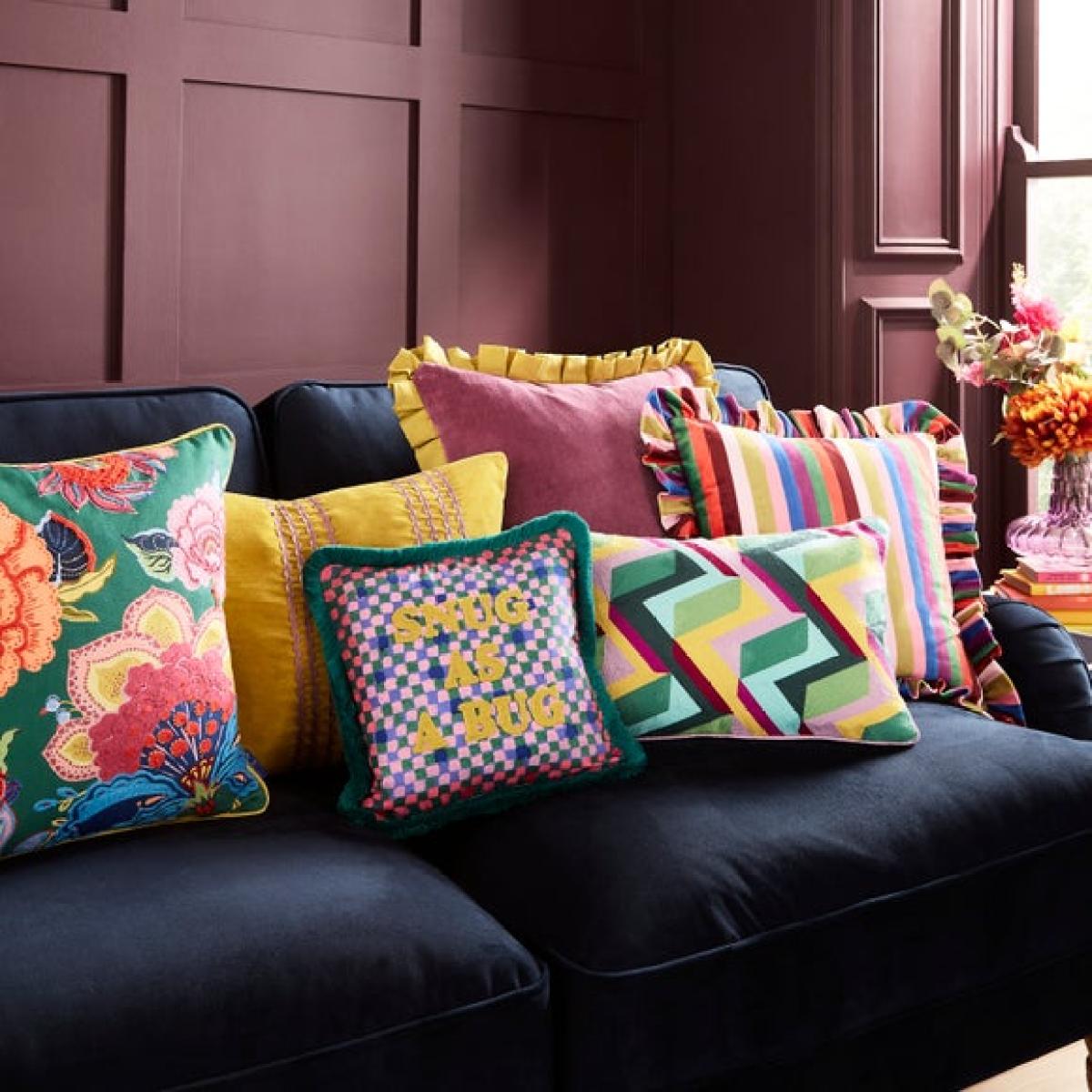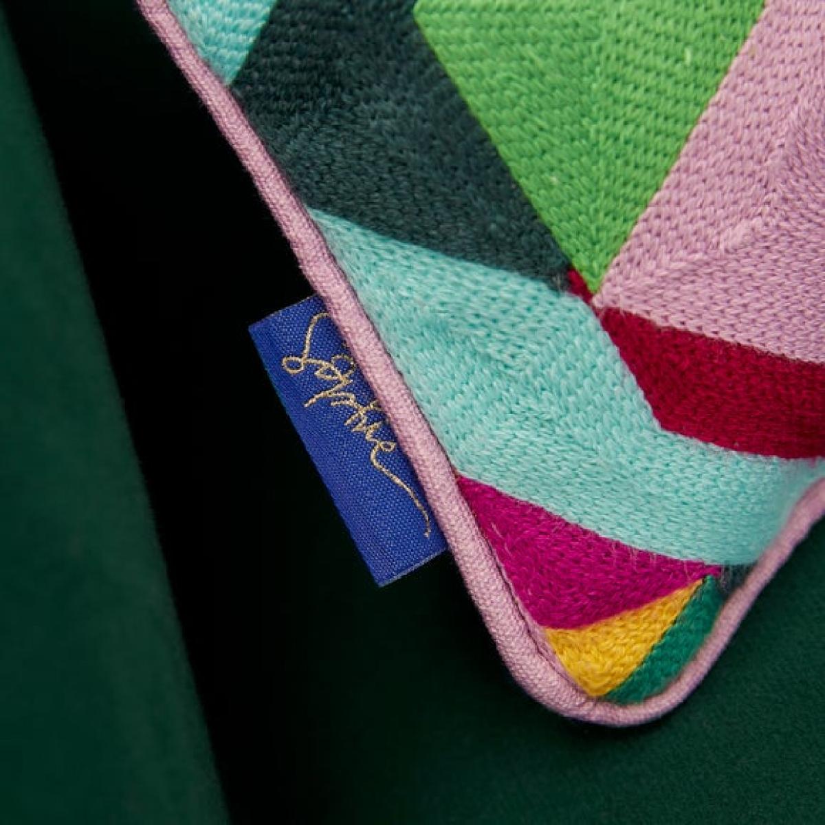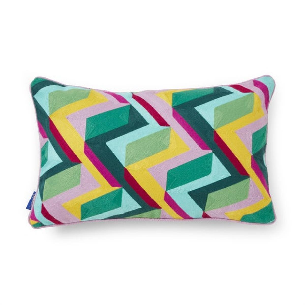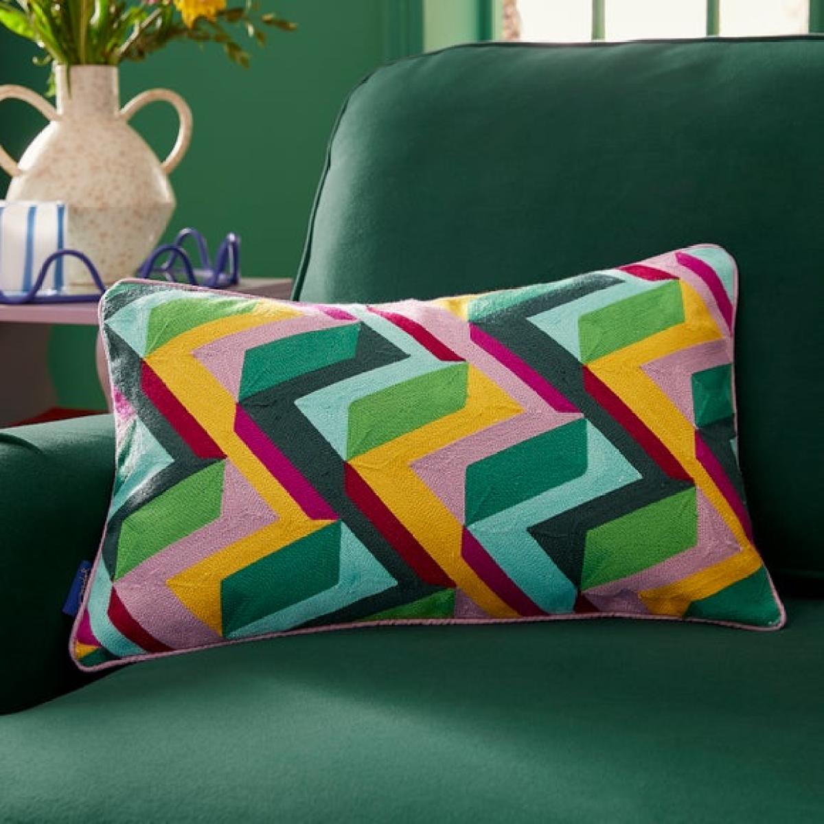 * 100% Cotton * Zip closure * Beautiful crewel work * Machine washable Give your space a zigzag zing! This Sophie Robinson rectangle cushion combines vibrant colour with detailed crewel work for a textured, handcrafted look. 100% cotton and machine washable for easy upkeep.