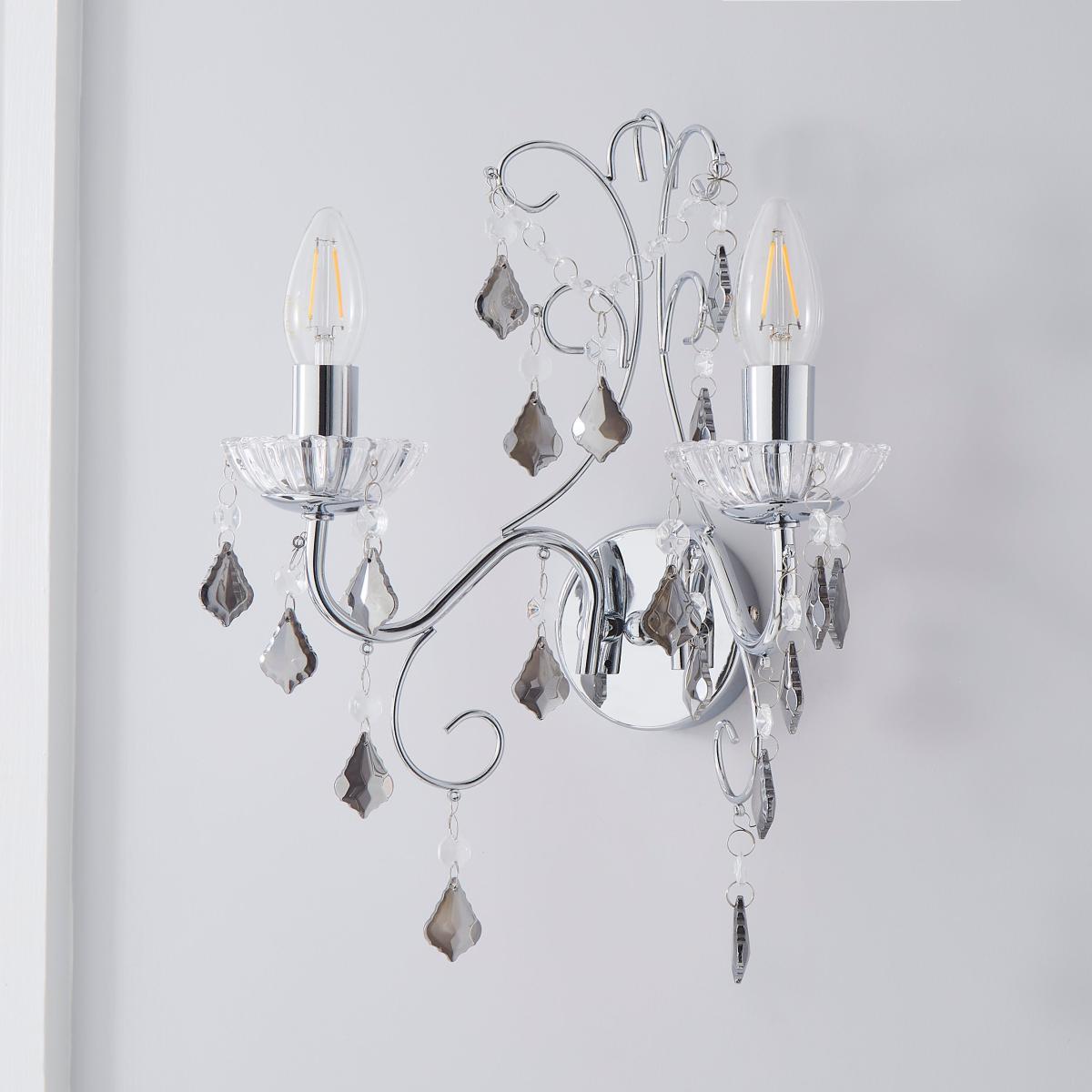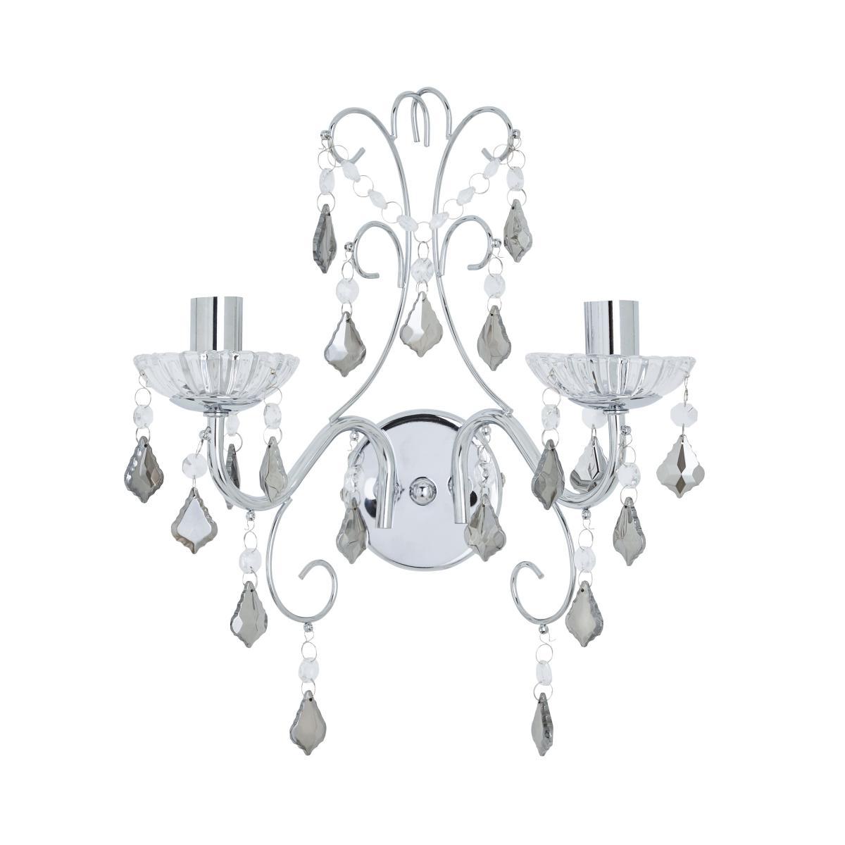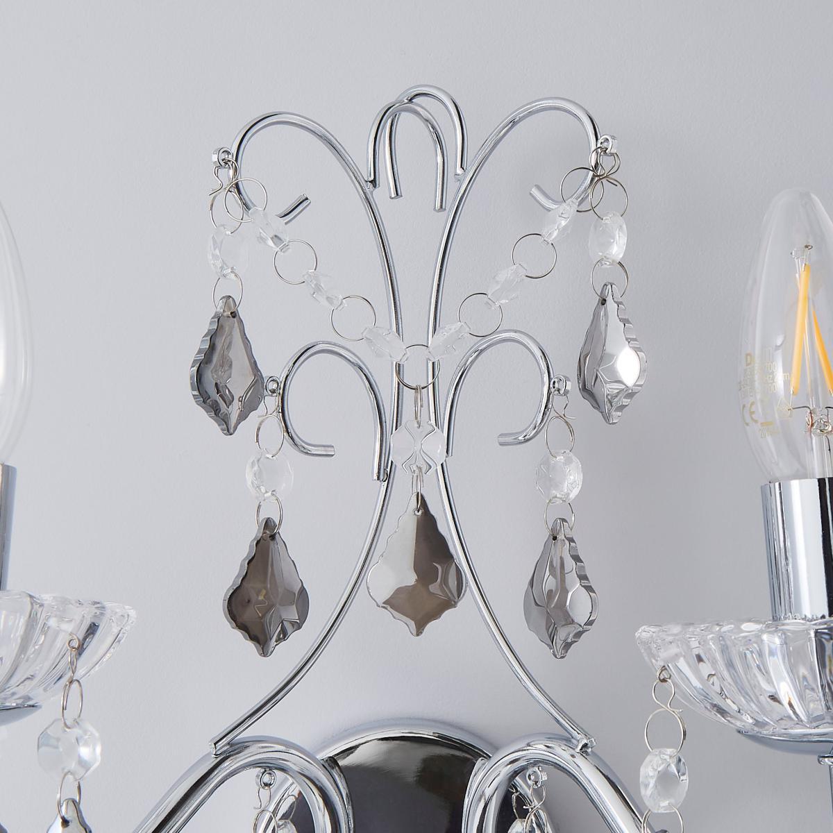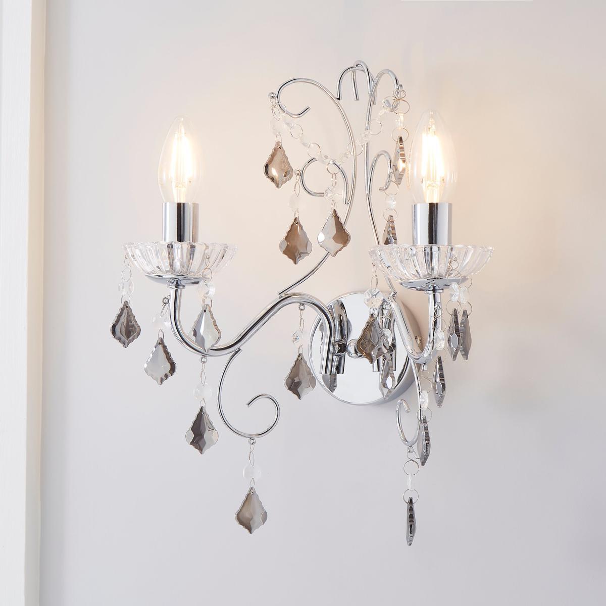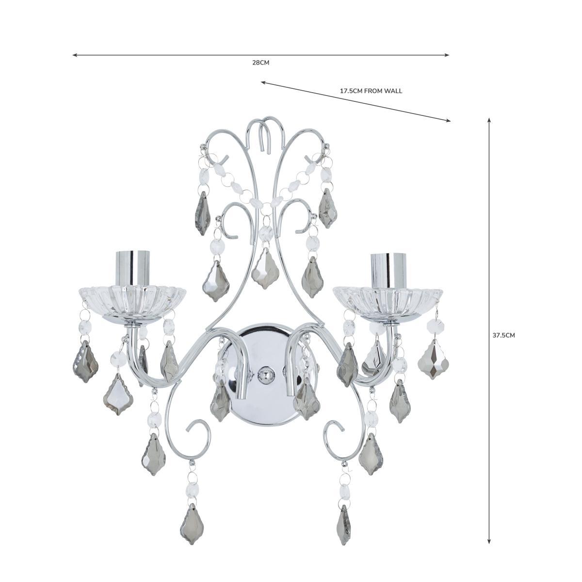 Designed with sweeping, chrome finished arms draped in smoked diamond-shaped acrylic droplets and looping clear beads, the Sophy wall light would bring an elegant and glamorous look to any space. This stunning wall light comes complette with clear glass sconces to complete the look.