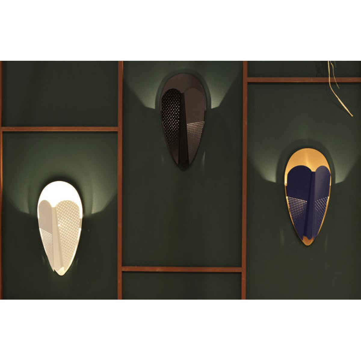 Sorcier is a wall light inspired by the ritual Ngil masks of the Fang tribe in Gabon. The light appears through the perforations in the mask and shines upward in a graphic and gentle way. More than a light, Sorcier is a sculpture. It changes personality depending on the combination of colours, textures and perforations patterns.