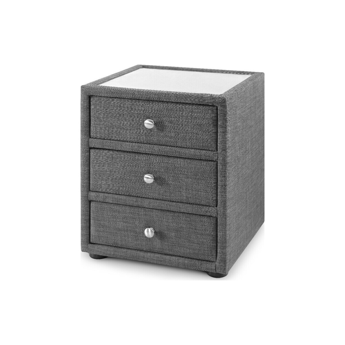 The Sorrento Three-Drawer Bedside Cabinet is an elegant and eye-catching addition to any bedroom. It has an entirely upholstered finish gives it a unique look and simple brushed steel handles and a clear glass tabletop add functionality and style. Each storage drawer provides ample space for your bedside essentials. Fully upholstered in slate grey linen fabric. Three spacious drawers for convenient bedside storage. Hardwood, foam and fabric construction. Perfect accompaniment to other pieces in the Sorrento Collection.