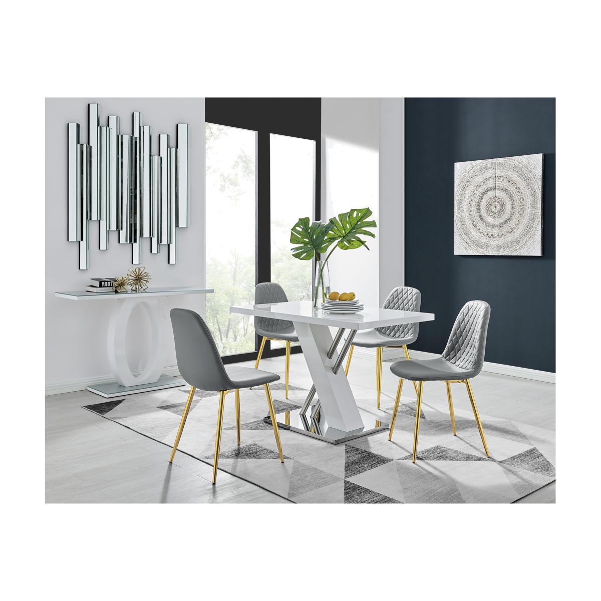 With a unique design and high quality finish throughout the Sorrento dining table really is a must have! The dining table is a stunning combination of high gloss and stainless steel metal boasting a 120x70cm surface, which allows plenty of room for dining with guests. As well as providing style the chrome metal legs act as an extremely strong support for the table and are finished to the highest standards. The table features easy wipeclean surfaces meaning your table will stay looking brand new for years to come! Exuding style and quality the Sorrento table is capable of being a centre piece in any modern home and really is a must have!Pair it with our Coronachairs for the complete look. With a perfect balance of pattern and texture the new Corona Chair is a statement piece ready for the modern dining space. The trendy gold or silver chrome legs are all the rage and offer a perfect way to add an accent of lustre to your home. The Scandi-style faux leather seat with diamond pattern stitching is a unique take on a classic design offering comfort and durability for everyday use.
