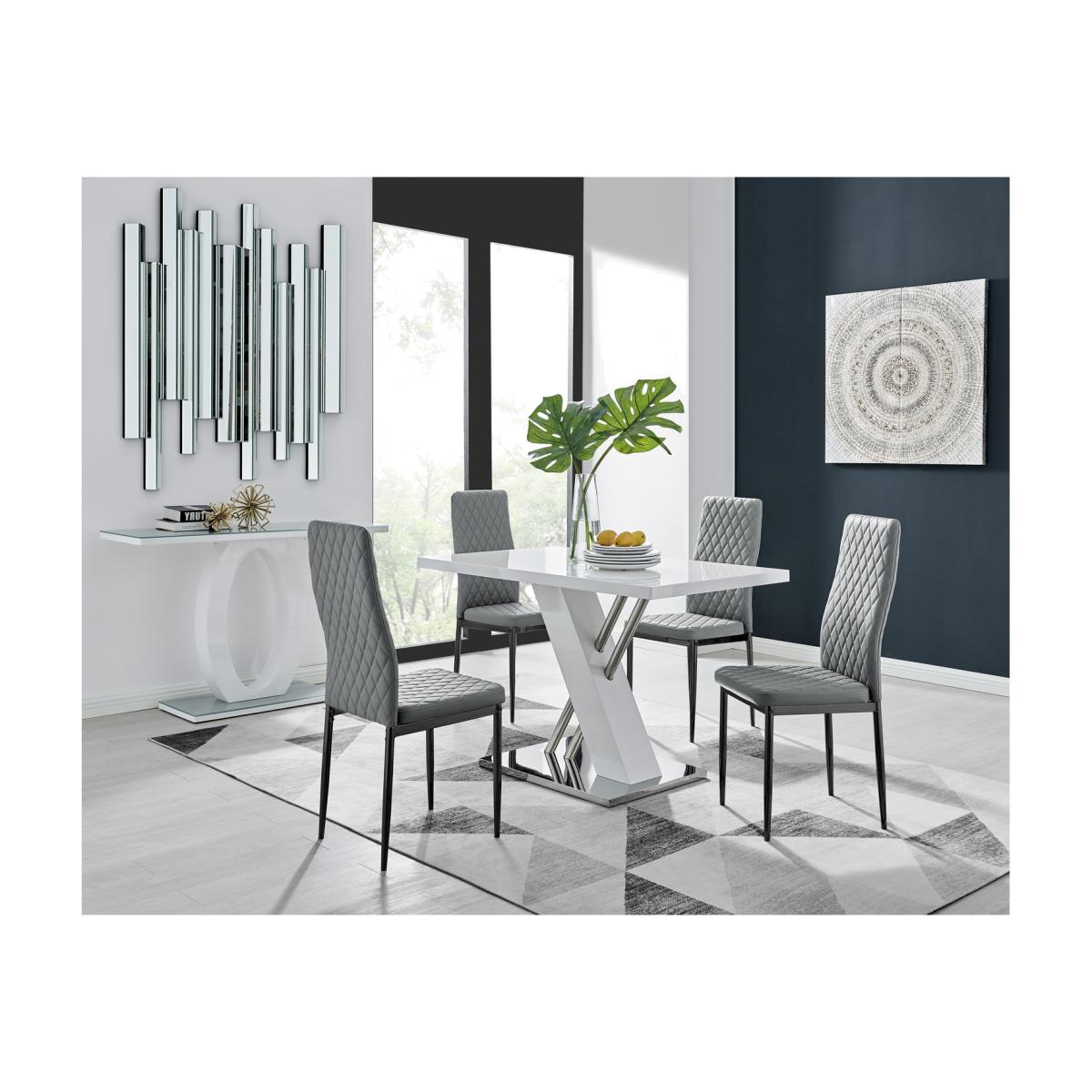 With a unique design and high quality finish throughout the Sorrento dining table really is a must have! The dining table is a stunning combination of high gloss and stainless steel metal boasting a 120x70cm surface, which allows plenty of room for dining with guests. As well as providing style the chrome metal legs act as an extremely strong support for the table and are finished to the highest standards. The table features easy wipeclean surfaces meaning your table will stay looking brand new for years to come! Exuding style and quality the Sorrento table is capable of being a centre piece in any modern home and really is a must have! Paired alongside our beautiful faux leather diamond quilted Milan dining chairs for a sophisticated contemporary look. The Milan chairs are made from high quality faux leather with sleek black powder coated legs and are ergonomically designed for maximum comfort and back support. Made for regular use, the protective plastic feet will protect your floor from any damage. Available in elephant grey, cappuccino grey, white, black or mustard to add your own personality and complete this gorgeous dining set.