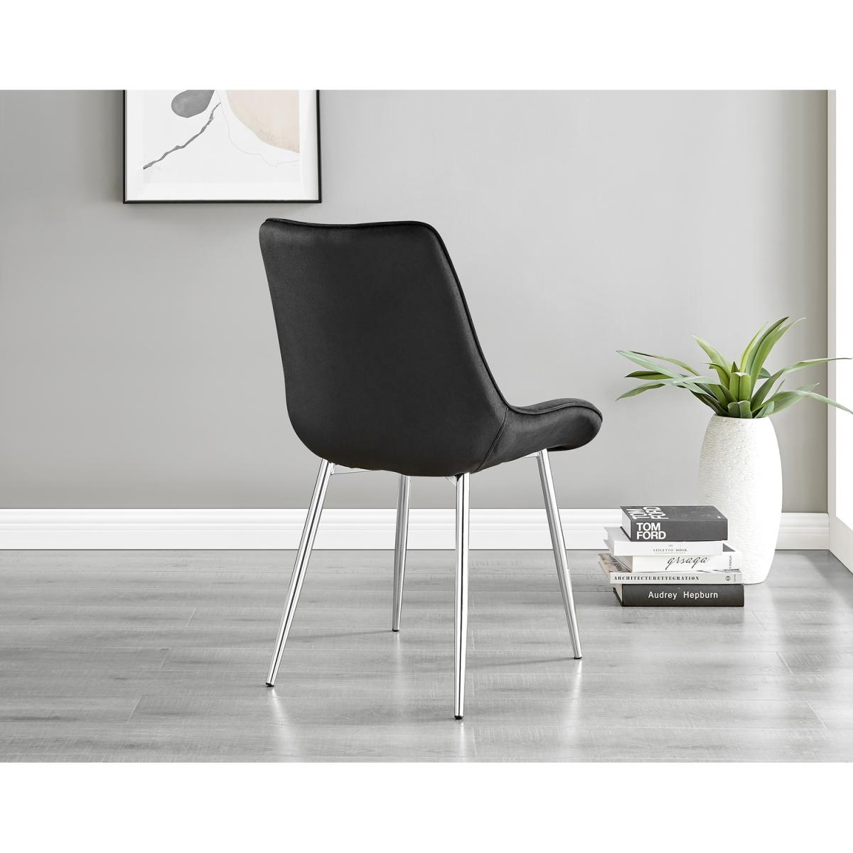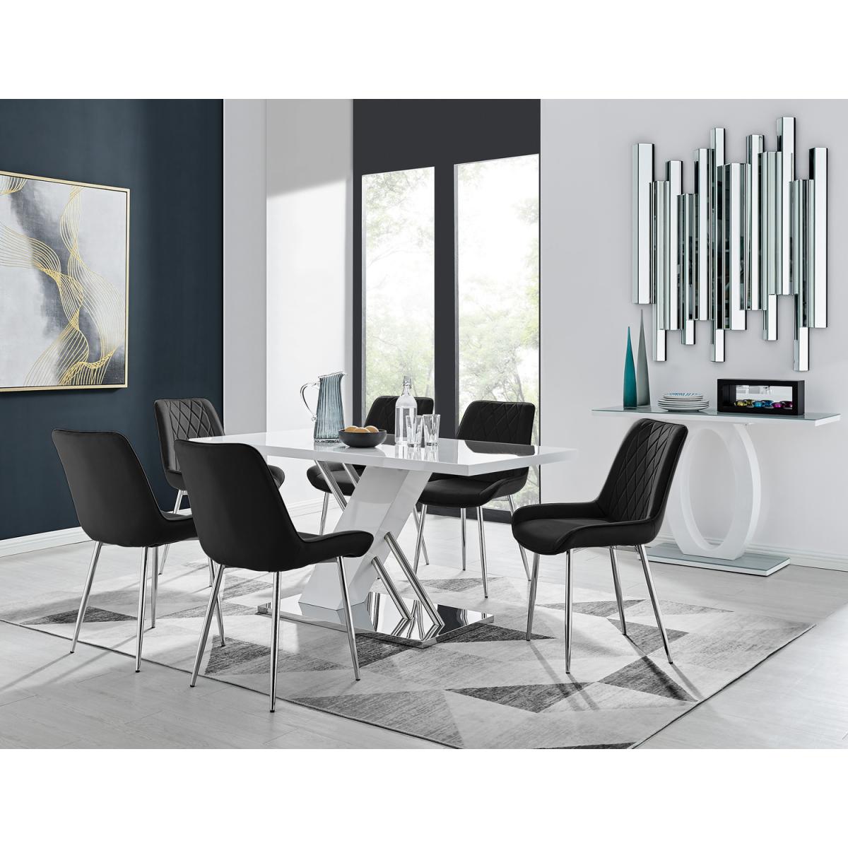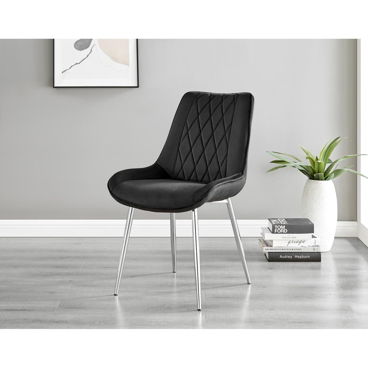 With a unique design and high quality finish throughout the Sorrento dining table really is a must have! The dining table is a stunning combination of high gloss and stainless steel metal boasting a large 150x80cm surface, which allows plenty of room for dining with guests. As well as providing style the chrome metal legs act as an extremely strong support for the table and are finished to the highest standards. The table features easy wipeclean surfaces meaning your table will stay looking brand new for years to come! Exuding style and quality the Sorrento table is capable of being a centre piece in any modern home and really is a must have! Modernise your dining area with our luxurious velvet upholstered Pesaro Dining Chairs. With a nod to the Mid-century modern design era, the Pesaro features gorgeous textured diamond stitching with an ergonomically designed curved seat pad blending seamlessly to the supporting medium high back rest. Sat atop elegant slightly tapered legs in black, chrome or gold effect. The Pesaro is a perfect match to any dining table or use as a luxe vanity seat in the bedroom, as an occasional chair for the living area or to add a bit of luxury to your home office.