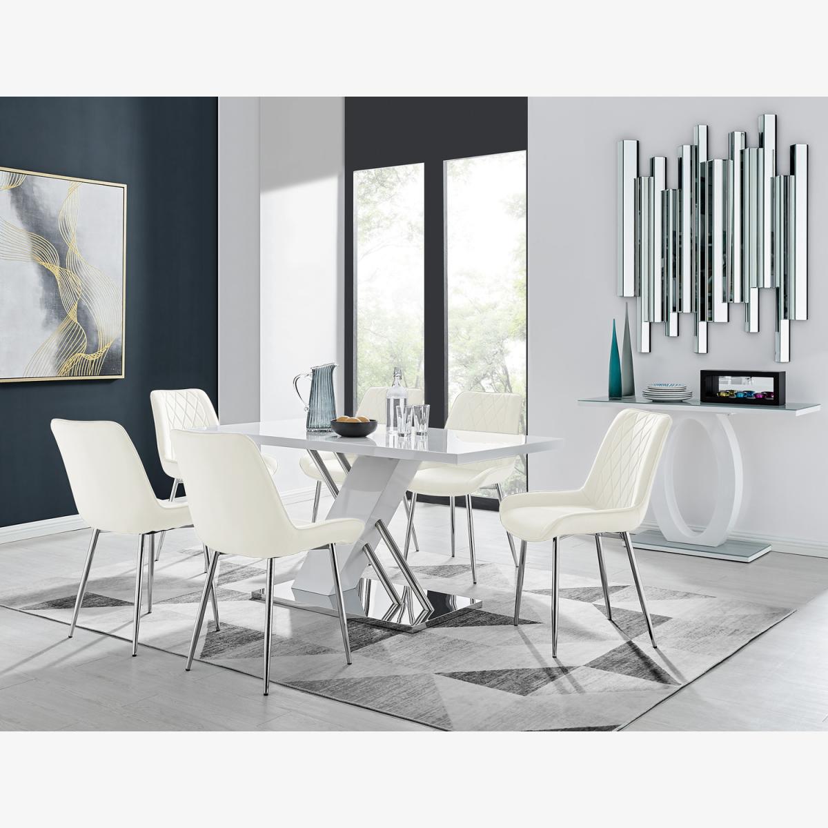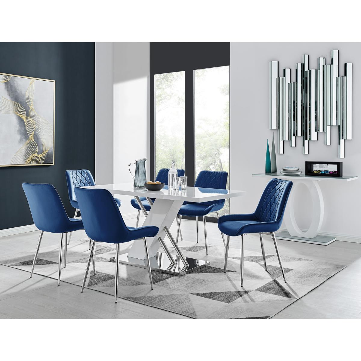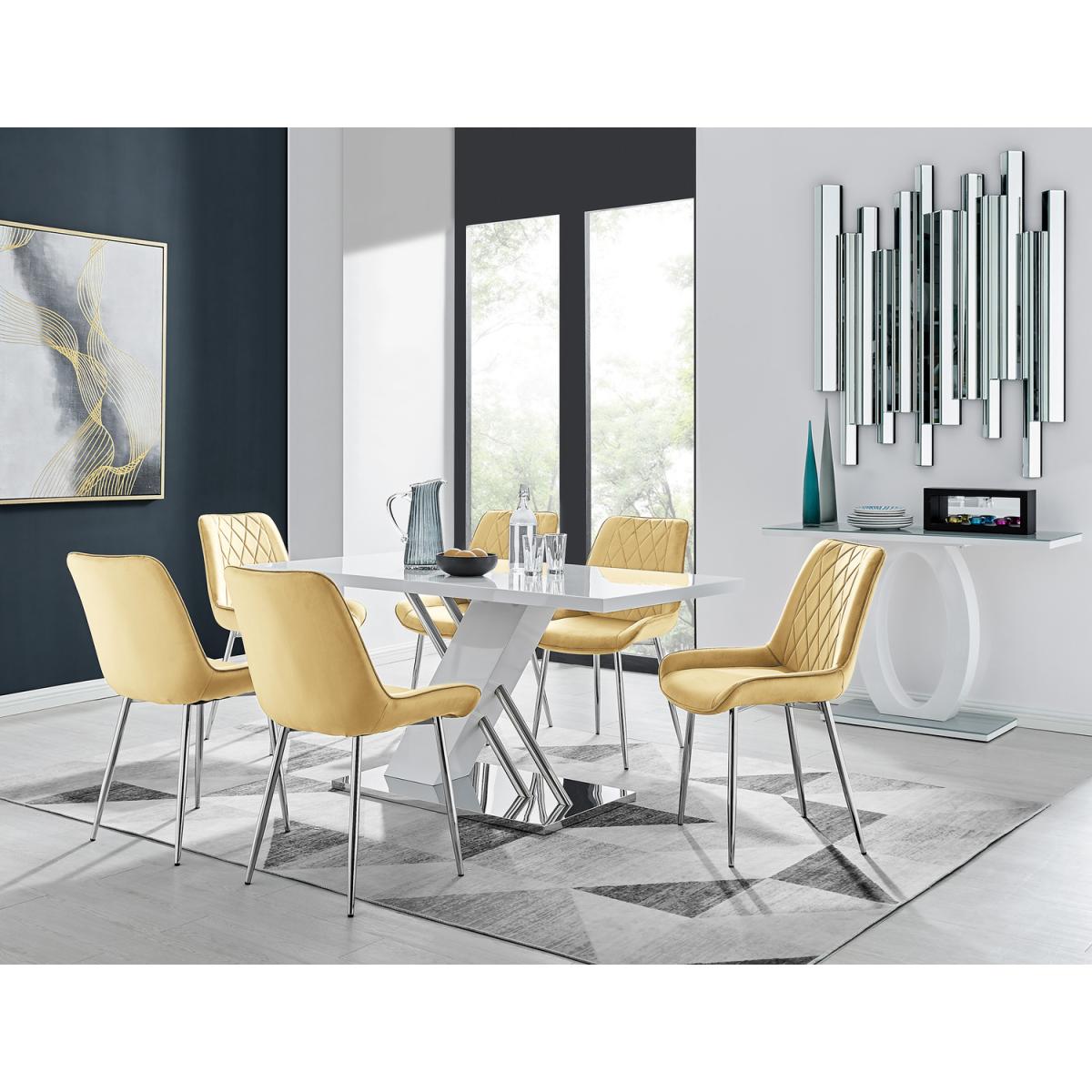 With a unique design and high quality finish throughout the Sorrento dining table really is a must have! The dining table is a stunning combination of high gloss and stainless steel metal boasting a large 150x80cm surface, which allows plenty of room for dining with guests. As well as providing style the chrome metal legs act as an extremely strong support for the table and are finished to the highest standards. The table features easy wipeclean surfaces meaning your table will stay looking brand new for years to come! Exuding style and quality the Sorrento table is capable of being a centre piece in any modern home and really is a must have! Modernise your dining area with our luxurious velvet upholstered Pesaro Dining Chairs. With a nod to the Mid-century modern design era, the Pesaro features gorgeous textured diamond stitching with an ergonomically designed curved seat pad blending seamlessly to the supporting medium high back rest. Sat atop elegant slightly tapered legs in black, chrome or gold effect. The Pesaro is a perfect match to any dining table or use as a luxe vanity seat in the bedroom, as an occasional chair for the living area or to add a bit of luxury to your home office.