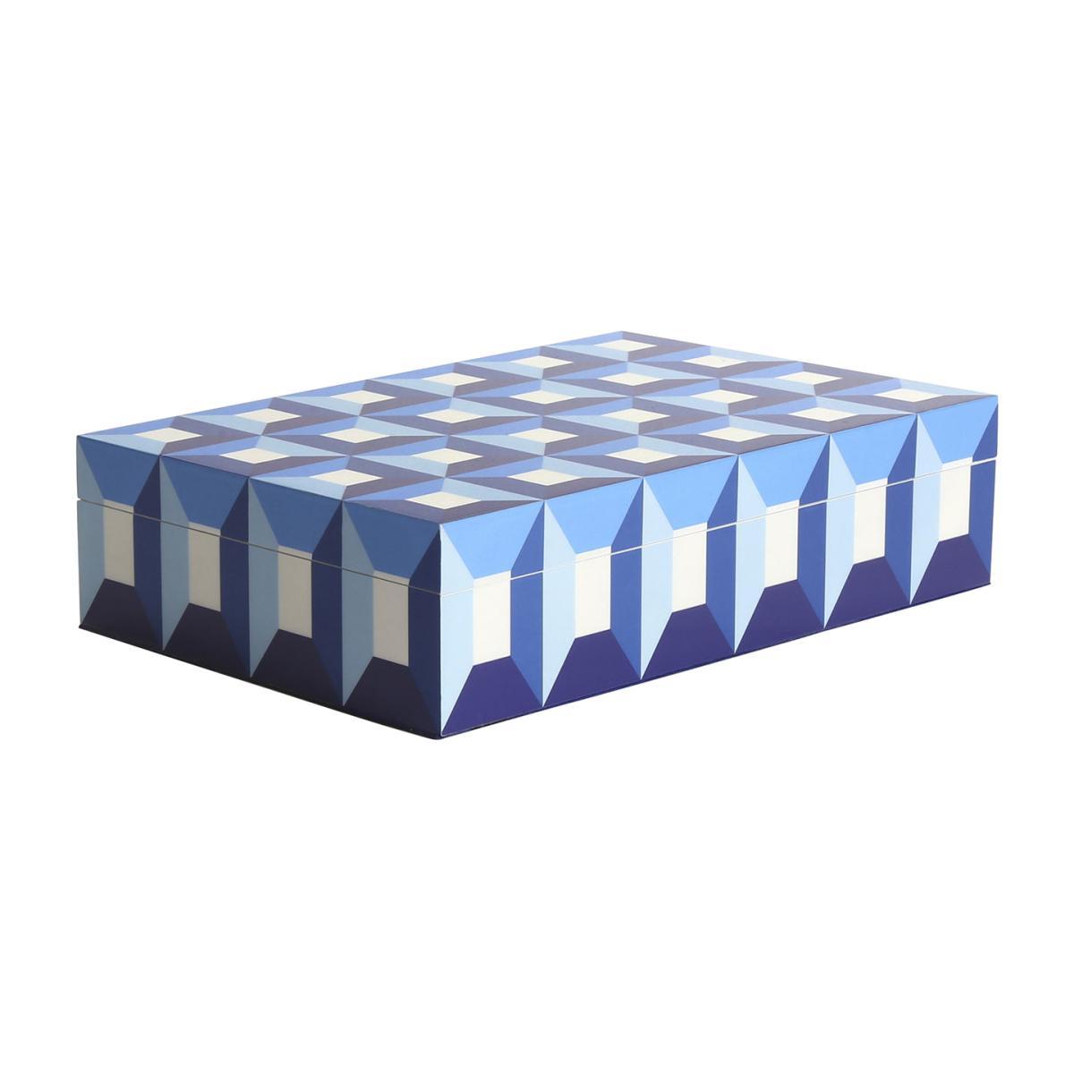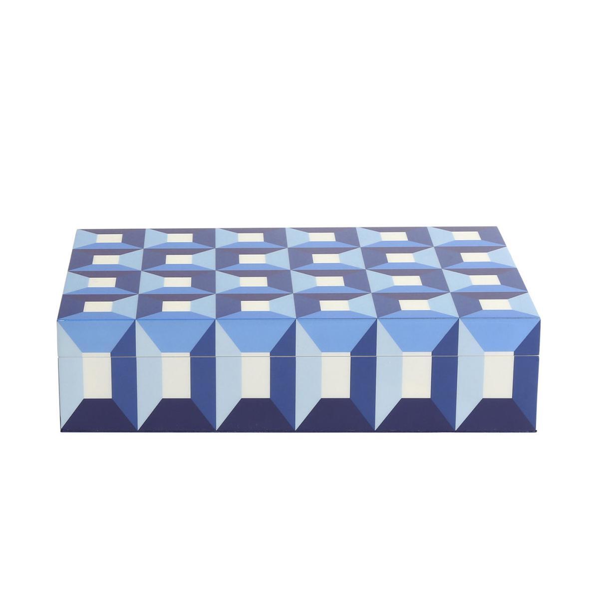 This lacquered wood box is decorated with a wonderful geometric decoration inspired by Op art, available in wonderful shades of blue. The contrasting patterns are enhanced by the brilliance of traditional hand-applied lacquer. The inside of the box is upholstered in blue velvet.