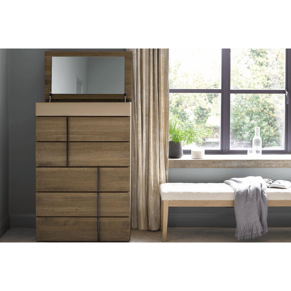 Get ready in glamorous style with Sorrento. Providing ample space across 5 drawers, a fabric accessory drawer available in our wide selection of velvets, linens, cottons, and more, and a mirrored flip up top that can be folded away at a moments notice, this wooden wonder is the perfect partner to prepare for a day of productivity or a night on the town.