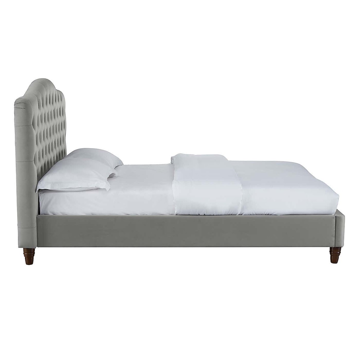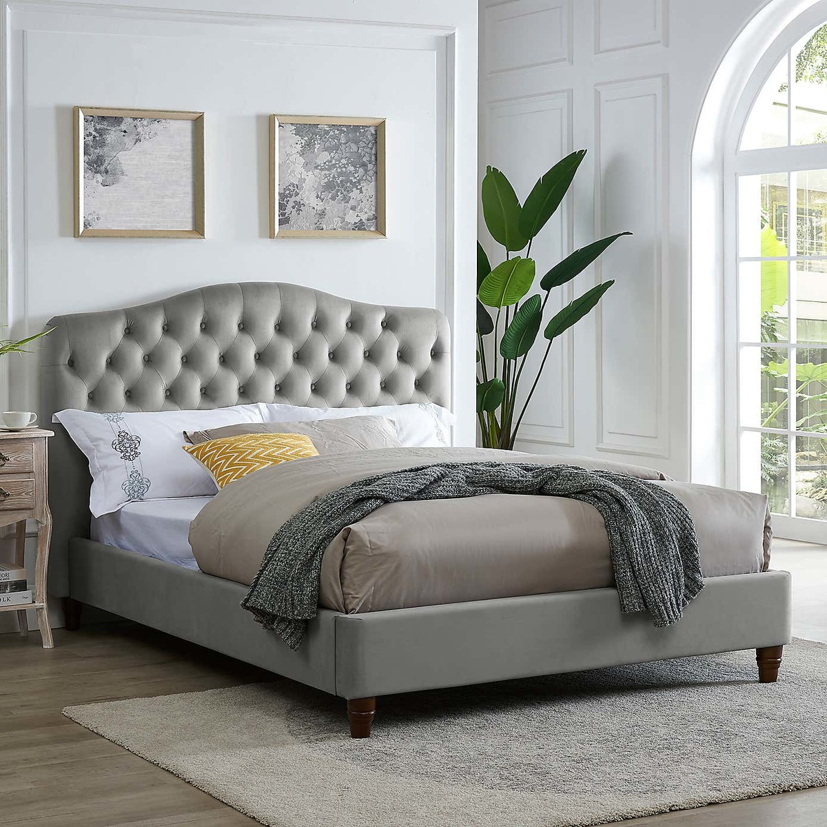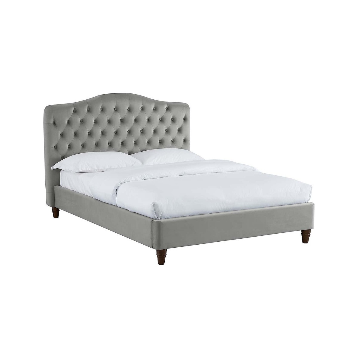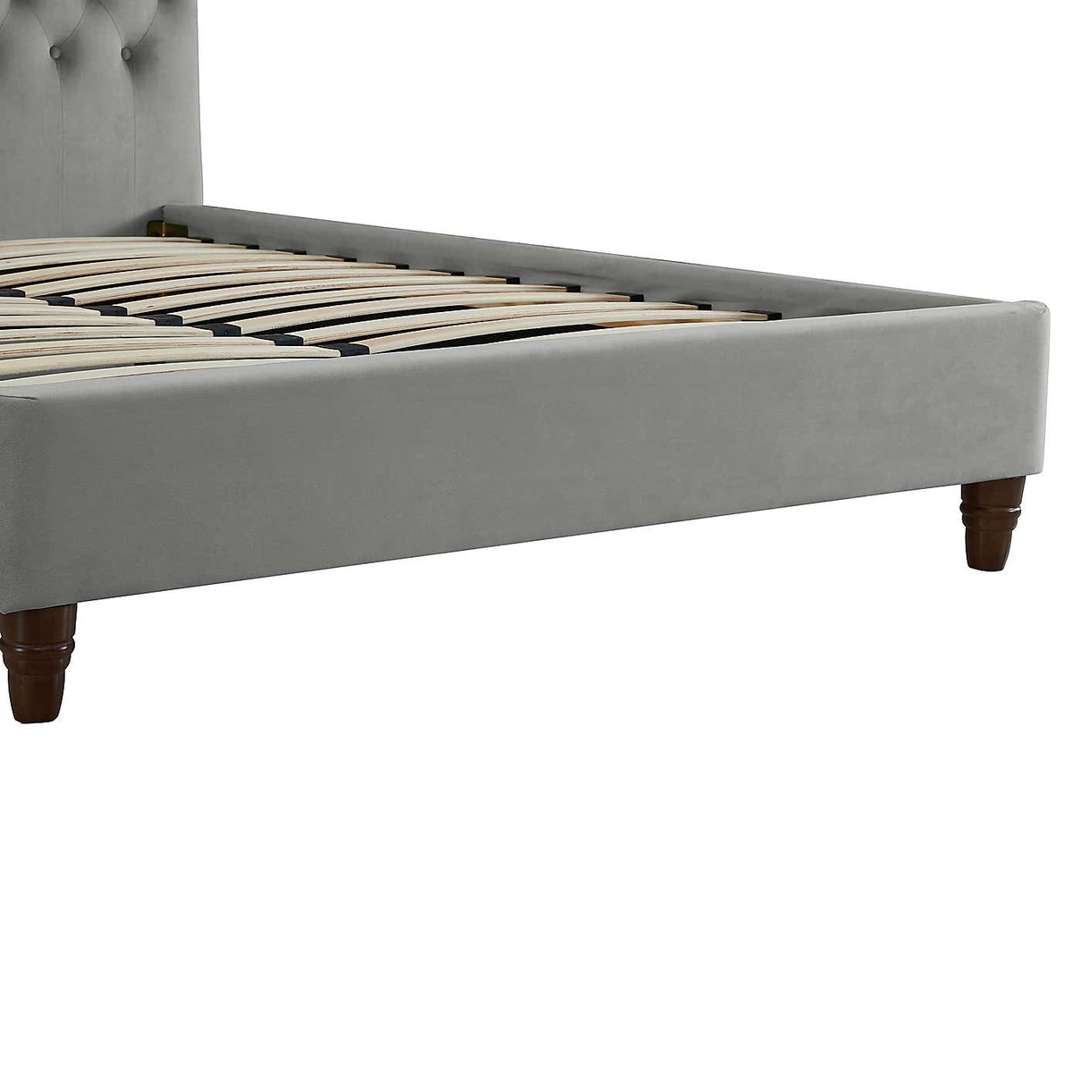Presenting a modern take on a classic design, the Sorrento bed frame is upholstered in a soft silver velvet fabric and features a stunning curved, button back headboard. Complete with dark wood finished legs, and comfortable foam padding this luxurious bed frame would make a great addition to your bedroom.