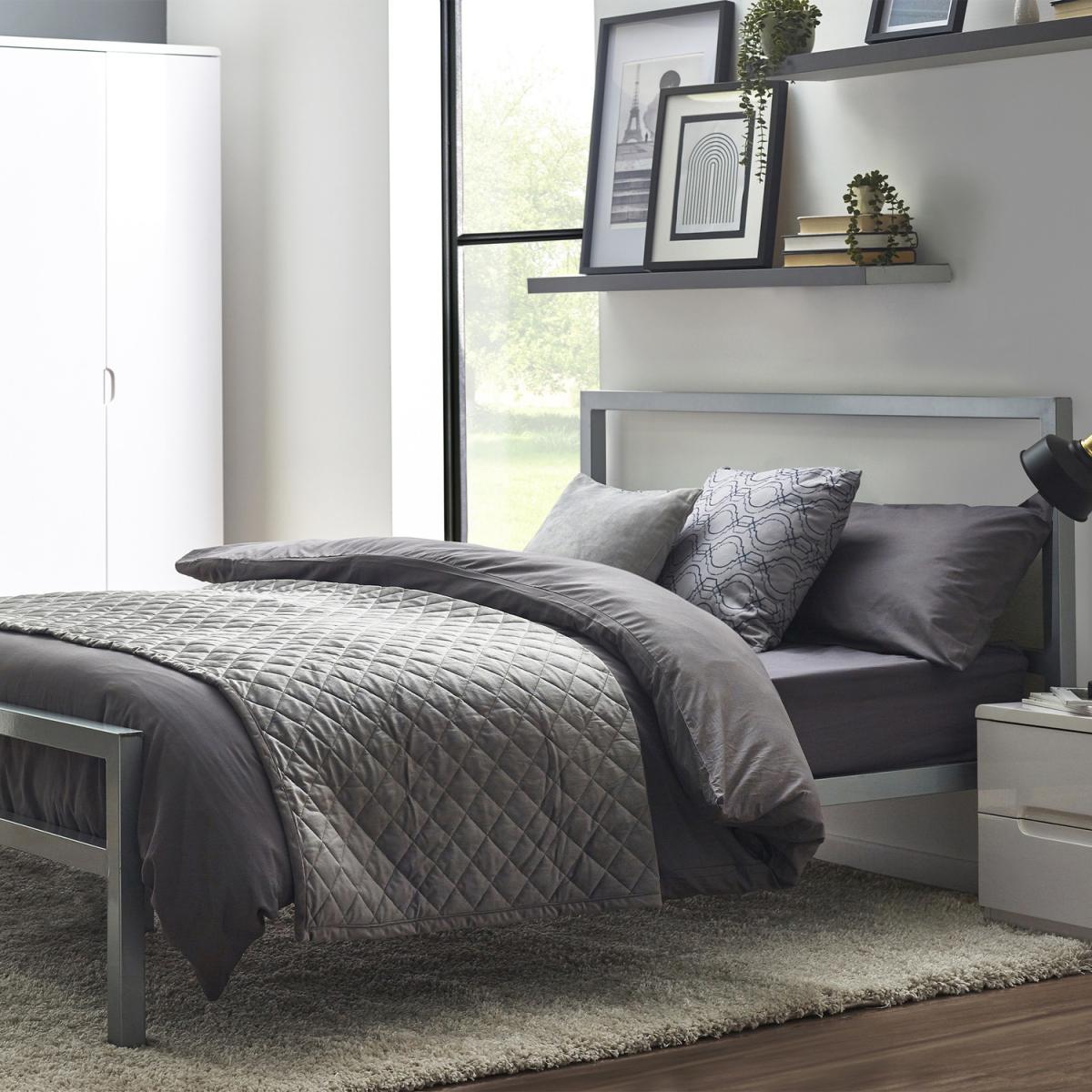 I really like this Soto bed frame’s sleek, metallic finish which adds a modern edge to both contemporary and minimalist interiors. Its silver hue makes it versatile, pairing well with a range of colour schemes from soft pastels to darker, moodier tones. It works especially well in bedrooms with a neutral or monochrome palette, creating a calm and cohesive look. For styling tips, consider keeping bedding simple and layered in textures-think crisp cottons or velvets-and adding metallic or glass accessories for a polished feel. To keep the space balanced, layer with cosy throws and pillows, and complement the silver frame with matching or contrasting bedside lamps and accessories to create a stylish yet practical bedroom retreat.