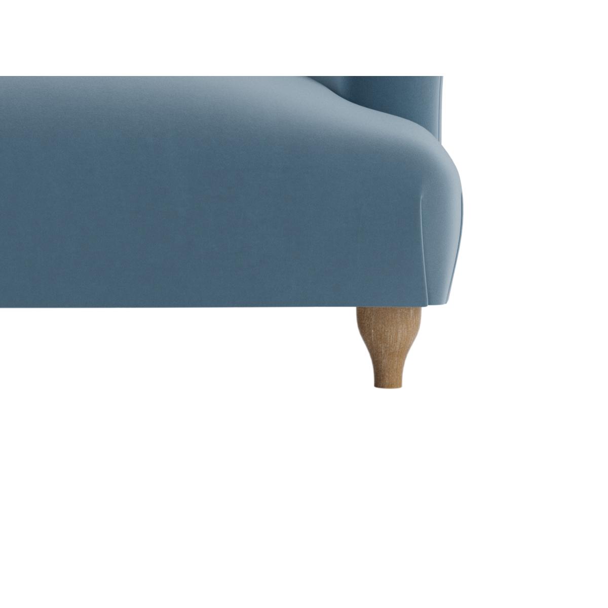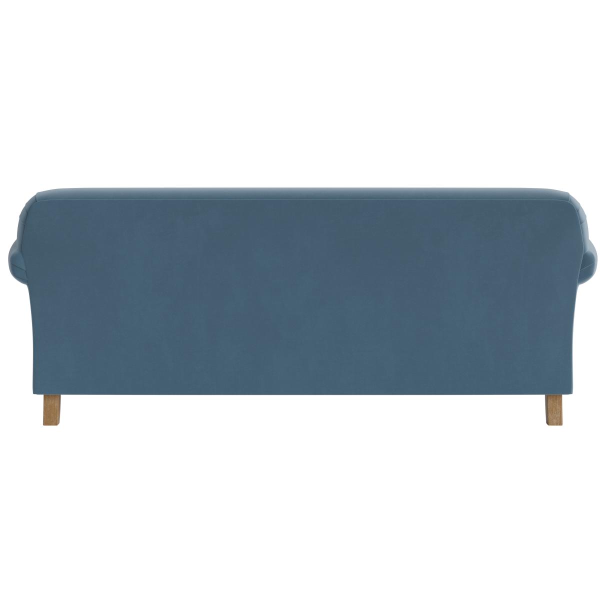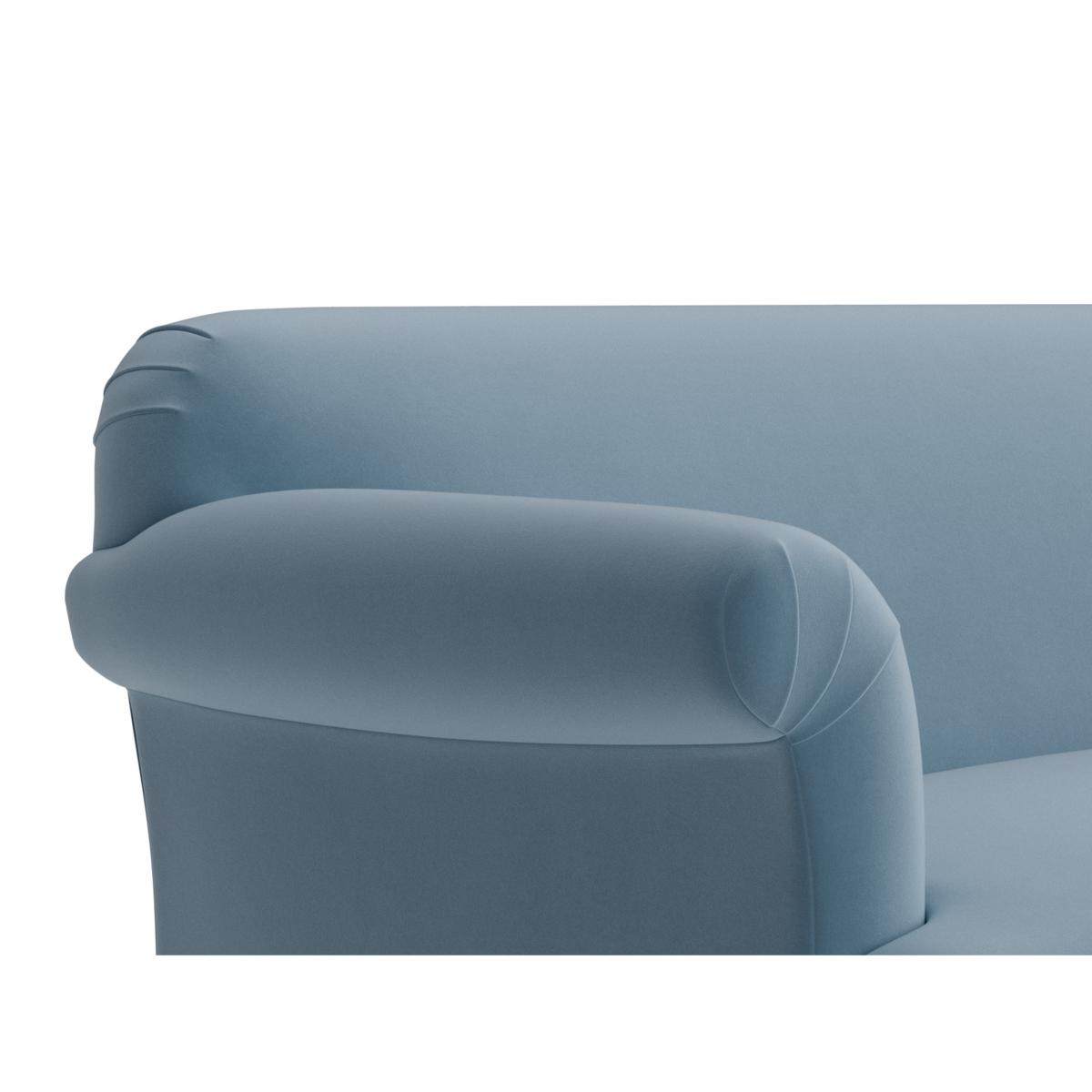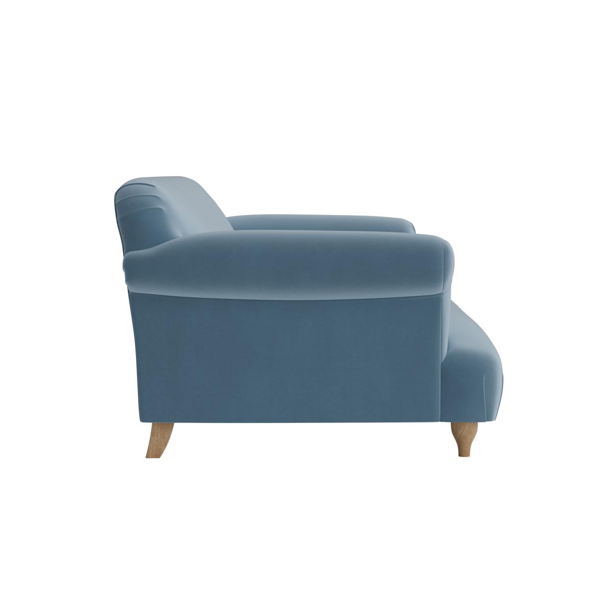 I love the comfy, inviting vibe of this sofa, which works especially well in cosy, classic or eclectic interiors. Its rounded, plush silhouette adds softness to a room, making it ideal for family spaces or relaxed living rooms. When styling, consider pairing it with tactile textiles like chunky throws or patterned cushions to enhance its cosy appeal. It also pairs nicely with wooden or brass accents to add warmth. Because of its neutral blue tone, it fits seamlessly in both contemporary and vintage-inspired schemes, but you can also introduce pops of colour through accessories to keep the overall look fresh. Keep styling simple to let the shape and colour of the sofa stand out, making it the focal point of your room.