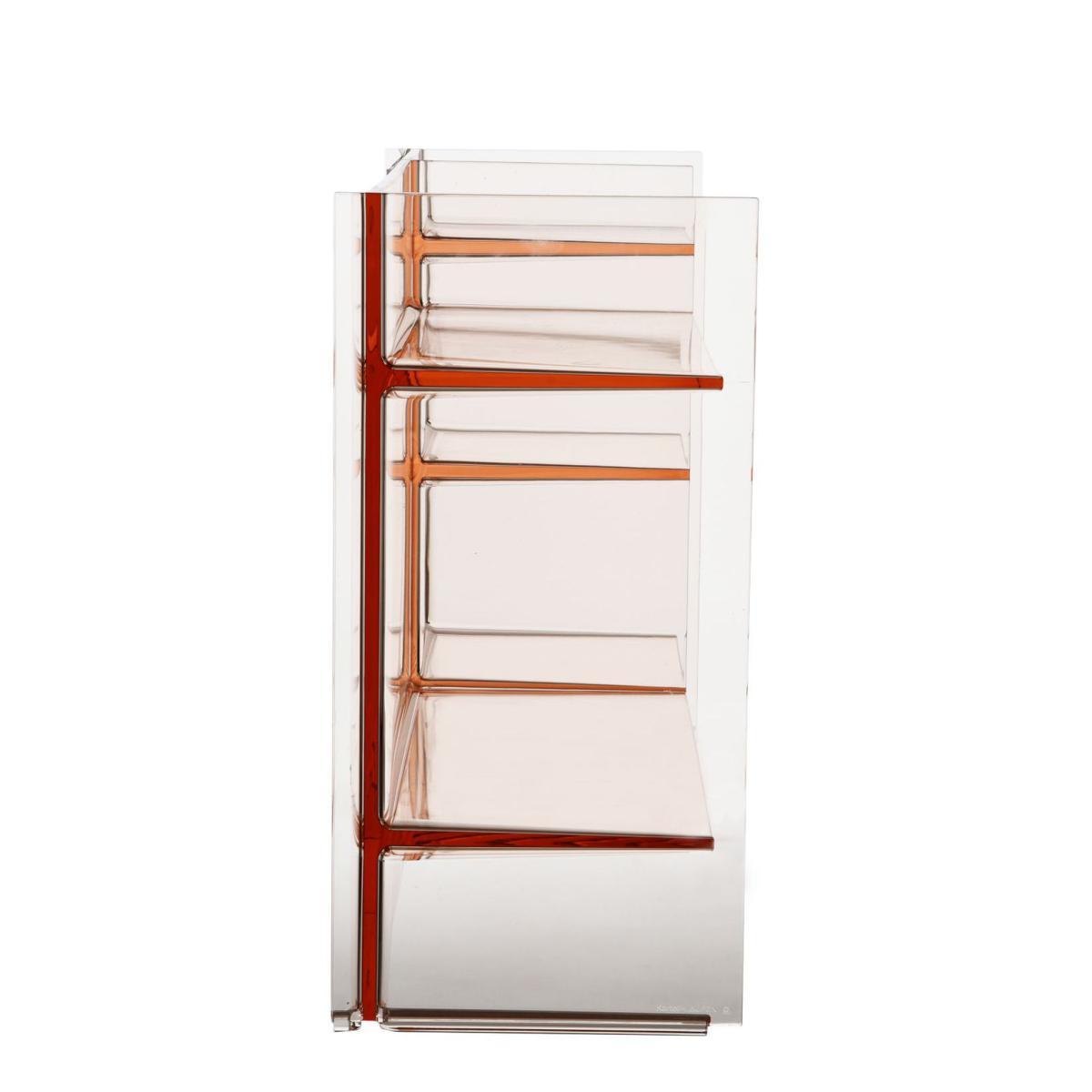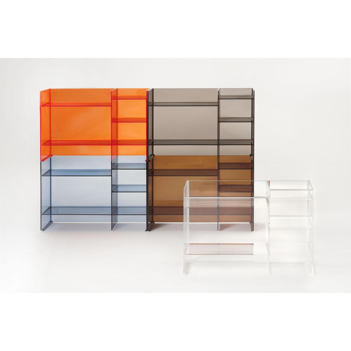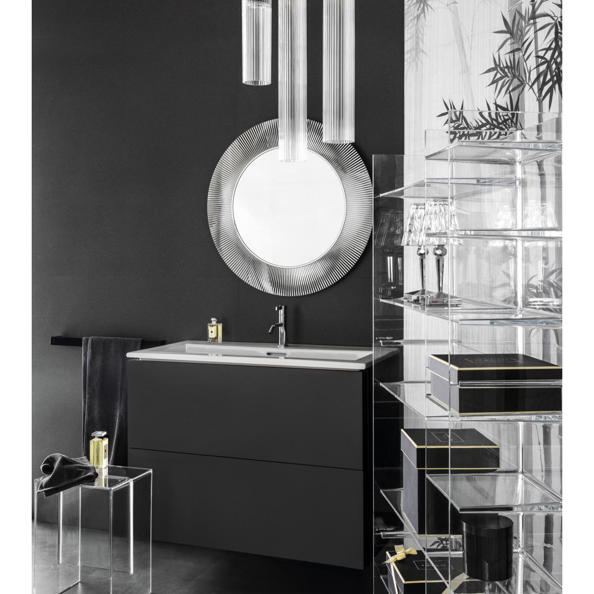 "Kartell now floods our bathrooms with an excellent collection of accessories signed by the Italian designers and architects, Ludovica & Roberto Palomba. A whole line of objects and small furniture that combine transparency and colours, refined and functional lines, refinement and simplicity. Made in PMMA, Sound-Rack furniture integrates well in all rooms by playing the transparency card. This simple and communicative shaped storage unit can be set up and live anywhere. The different compartments allow you to efficiently store and organise your things. Sound-Rack will accommodate towels and beauty products in the bathroom, clothes and shoes in the bedroom or even pots, plates and spices in the kitchen. Sound-Rack is stackable: you can put two pieces of furniture on top of each other so as to create elegant, graphic and chromatic compositions. The "Kartell by Laufen" collection is the fruit of the collaboration between the Kartell brand and the Swiss house Laufen, ceramics specialist. Under the artistic direction of Ludovica + Roberto Palomba, this bathroom project is very complete and uses of both companies' expertise. The patented ceramic sinks and bathtubs find their counterpoint in the multicoloured light from the plastic accessories. ".